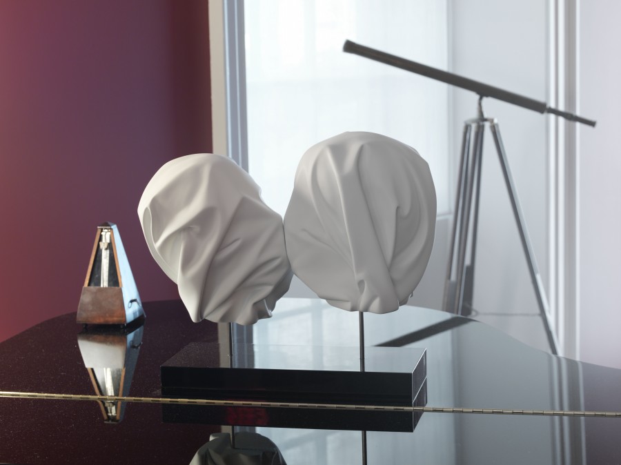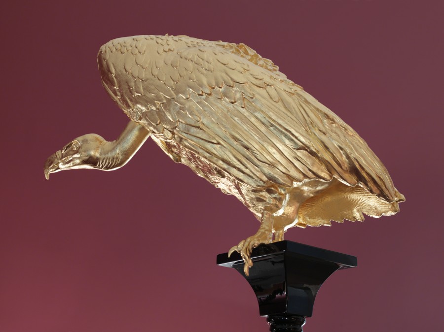 Giving an impression that Swann — a melancholic, striving architect in his seventies — has just left his apartment, the installation by these two enfants terribles of the art world encourages a participatory experience to explore given details about the character. A jacket randomly placed on a couch, or a drafting table full of incomplete architectural outlines substitute for their missing owner. Bright white pillows with intricate embroideries are positioned on a large size bed, which holds a gold-plated vulture nestling one of the wooden bedposts. With its imposing posture and piercing stare, the avian sculpture, entitled The Critic, is only one of few recurring icons in the duo’s oeuvre.