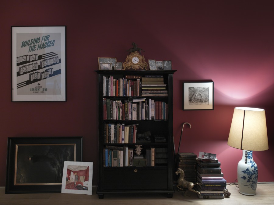 A sculpture of two kissing male heads in disguise under wrapping white sheets, is not only a direct homage to Magritte’s The Lovers, which uses the same imagery for a heterosexual couple, but also a work the duo presented before. Mr. Swann‘s bookshelf, holding a generous collection of examples from Western canon, from Joyce to Proust (whose famous character Charles Swann) is Norman’s namesake, reveals further details about his character in terms of his literary taste and world-view, as do his small collection of utopian architectural tomes from the 1970’s.