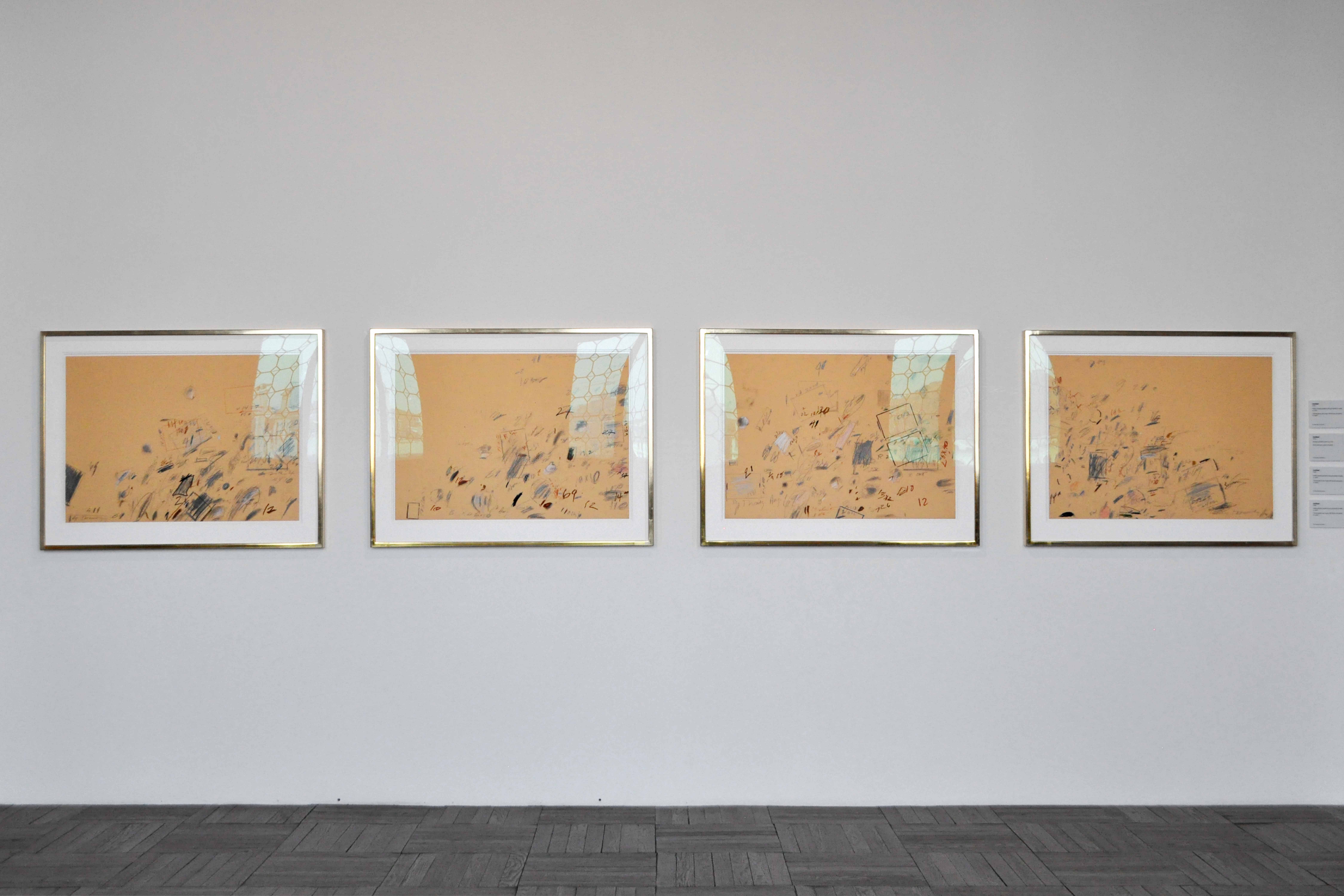 The display at Ca’ Pesaro includes Untitled (Camino Real II, V, VI, VII) a series from 2011 that depicts gestural yellow, red, and orange baroque circles. Vibrating against a bright green backdrop, these idiosyncratic marks are just one of Twombly’s emotive motifs, conveying notable energy and motion, complemented by vibrant color interactions that result in pulsating line distinction inside a world of loose marks and resultant drips. Four corners contain what appears to be a wildly abstracted frenzy.