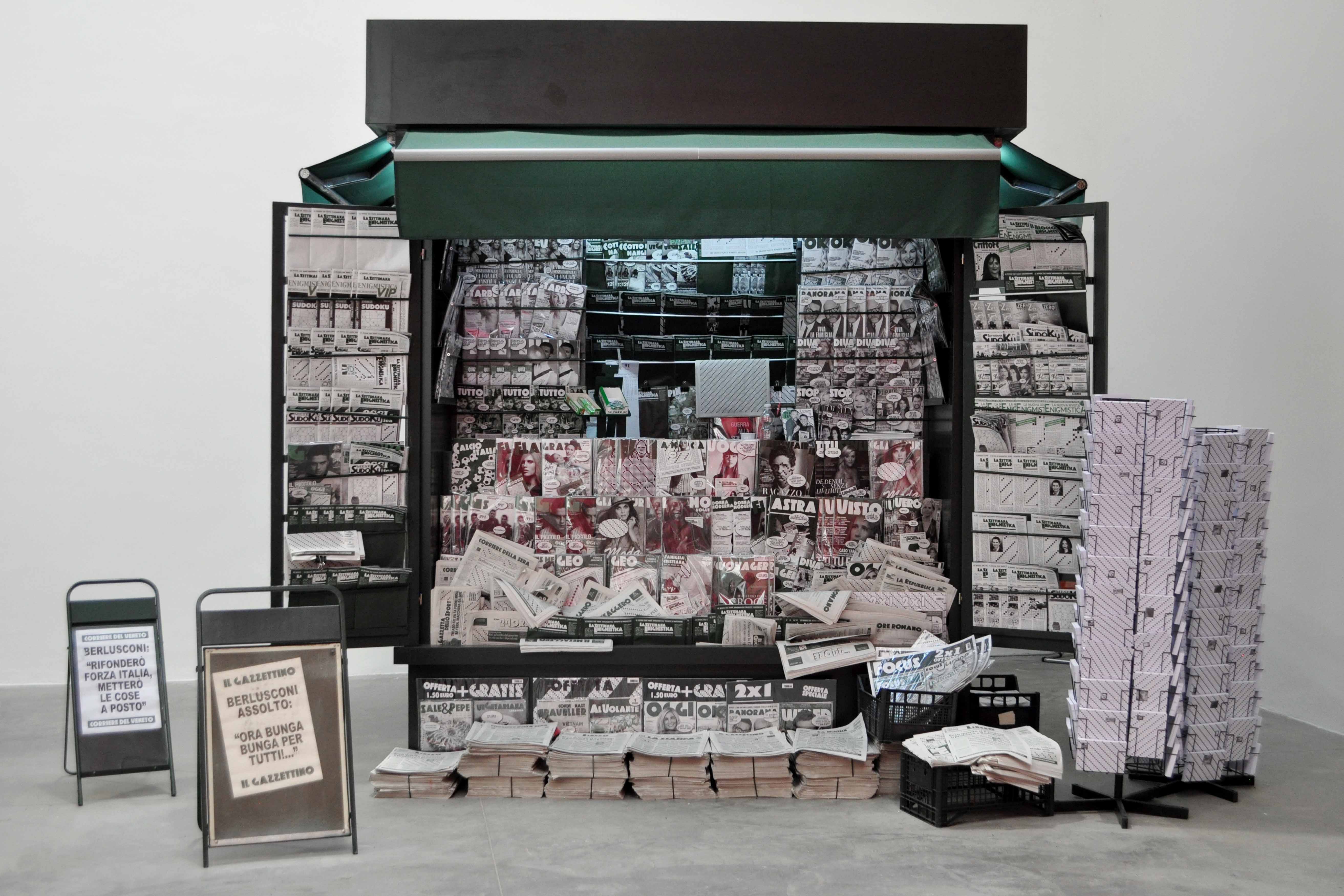 Another highlight of the Giardini was Japan’s curated show, featuring The Key In Hand, an installation by Chiharu Shiota, in which a small boat is engulfed in a cloud of keys, each adorned with red string. The colors, combined with the room’s lighting, is an illusory experience, immersing the viewer in swirl of color. In another packed exhibition, the Canadian pavilion had been transformed into a convenience store and art studio, where cluttered paint cans played off against the tightly arranged food products and snacks, a proposal for “unproductivity,” that seems to center specifically on incompleteness and consumption.