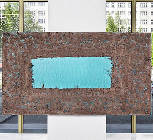 “I’m skeptical of the corporate form and the non-profit form,” he says. “I’m not necessarily skeptical of the people animating those forms.” Accordingly, his logos stand alone on the canvas, cracked and weathered in a reflection of their impermanent nature, even as an icon of a faceless corporation, a notion he extends to the art world proper: “Green was edgy in the 50s. Now it has becoming the slogan of the Fortune 500. Maybe reflecting the process of green imagery being co-opted by the death machine is appropriate for contemporary art?”