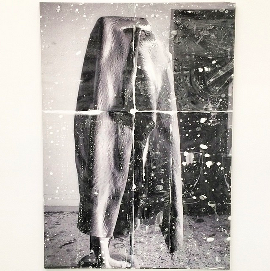 The work on view draws its background from two of the artist’s past series of work, his Silver Paintings, which are made from a 1992 photo shoot the artist ran with performer Massimo Audiello, who posed in front of the other series of works that inspired Salle’s work on view, his Early Product Paintings. Accordingly, the exhibition of the pair of canvas sets here feels like an exercise in cyclical history, a presentation of the photographic event as a catalyst for both the creation of wholly new works, as well as revisitation of the old.