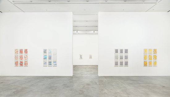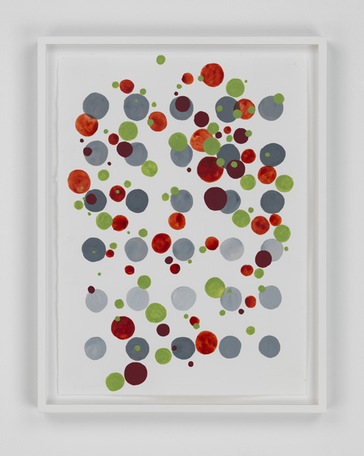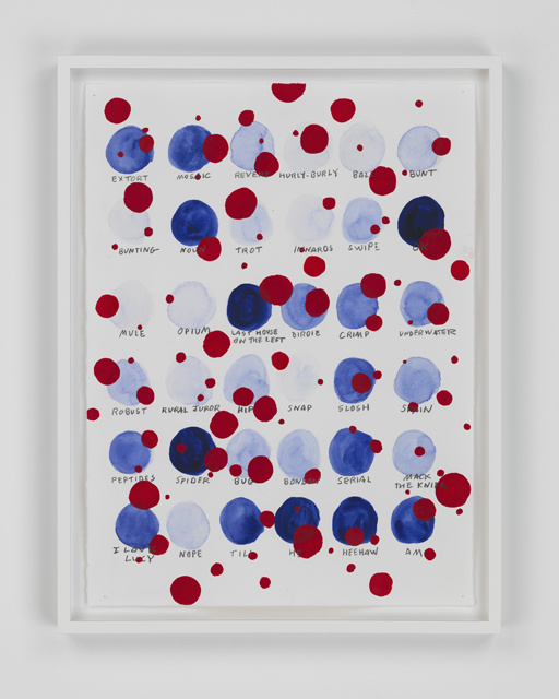 The show also features works from her Remembered Words series, dotted compositions that often feature grouped texts that seem like the product of automatic writing or randomly selected clusters. These variations, recalling early 20th century poetic experiments, also offer a reflection back on the artist herself, hinting at her own poetic compulsions at an atomic level, ostensibly arranging these seemingly disparate words based on their tonal appeal, either in sequence or individually.