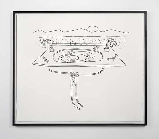Adjacent to these works are a series of ink drawings on paper, notably more withdrawn in their execution and scale, but also far more animated (pun not intended) in terms of their subject matter and action. A Lot Of Animals Are Looking Good On A Carpet, for instance, is so subdued in its treatment of his whimsical subjects that the viewer may find themselves moved to sudden spurts of laughter, while in another, Hollywood Girls, the artist shows a series of bikini-clad figures sucked down a massive drainpipe at the bottom of a desert-side swimming pool. Countering the dead-eyed gaze and slouching poses of his prints, the drawings on view seem to offer a second-side to Breuning’s recent practice. Where the Life series documents a subtle inflection of the surreal on the human body, the nearby drawings seem to work in reverse, charging animated works with an abundance of living energy and movement.