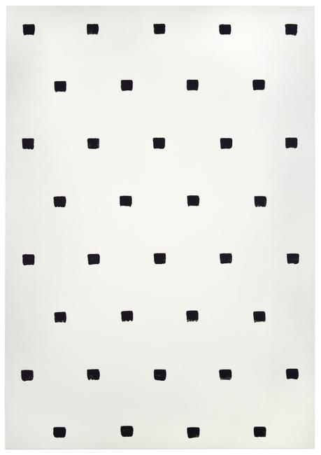 The work of Niele Toroni is currently the subject of a pair of shows this month, with exhibitions at the Swiss Institute through September 6 and at Marian Goodman Gallery through July 30. The Swiss-born Toroni is known for his reductive, repetitive paintings, emphasizing a conceptual approach which he executes with impressive regularity. According to some, the artist repeats his painting techniques to free his work from the formulaic politics of representation, and divorce art from authorship. Toroni creates site-specific and serial paintings, placing brushstrokes at regular intervals with a 50cm paintbrush, 30cm apart on a variety of surfaces including canvas, newspaper, and fabric. Toroni began employing this method during a 1967 performance in Paris.