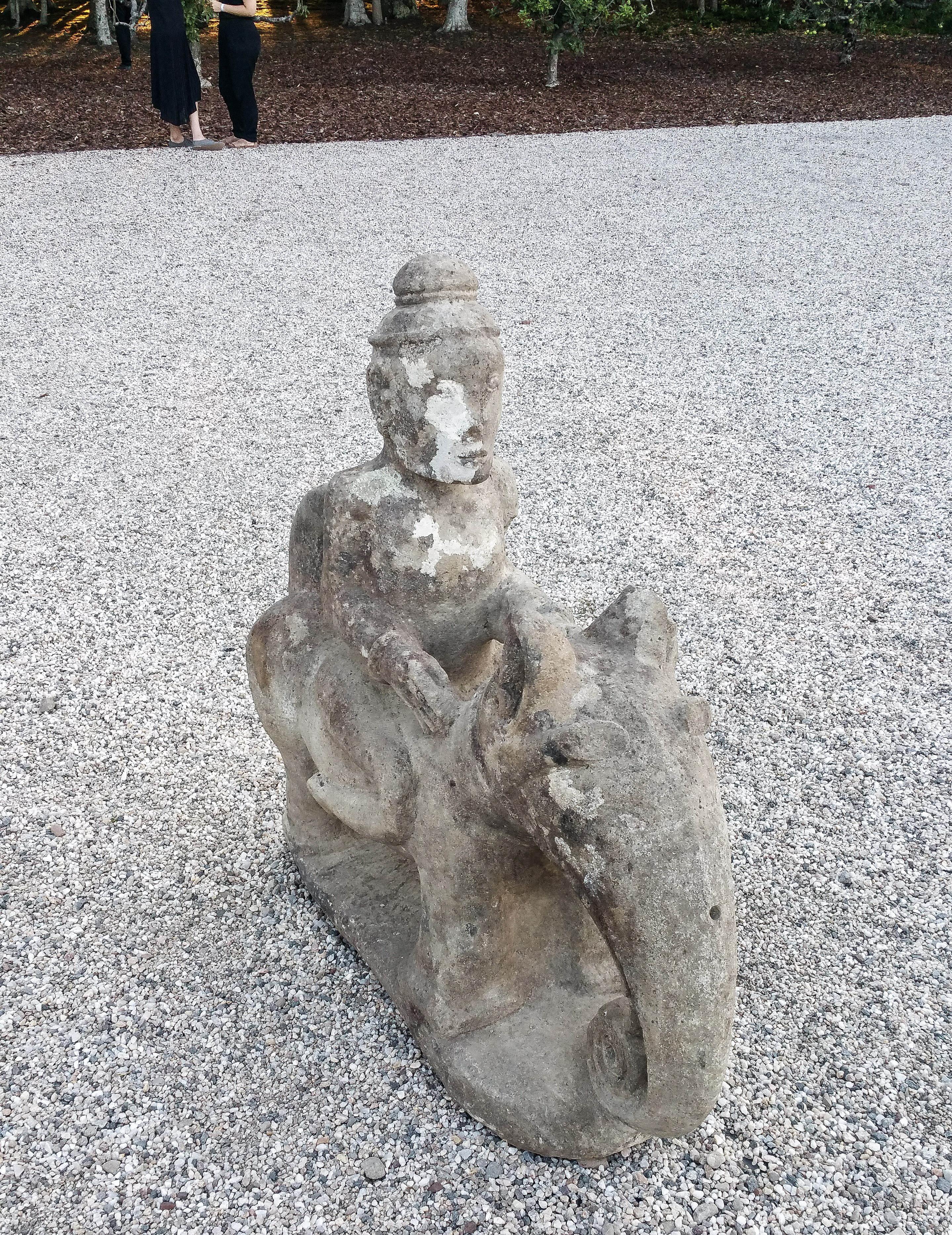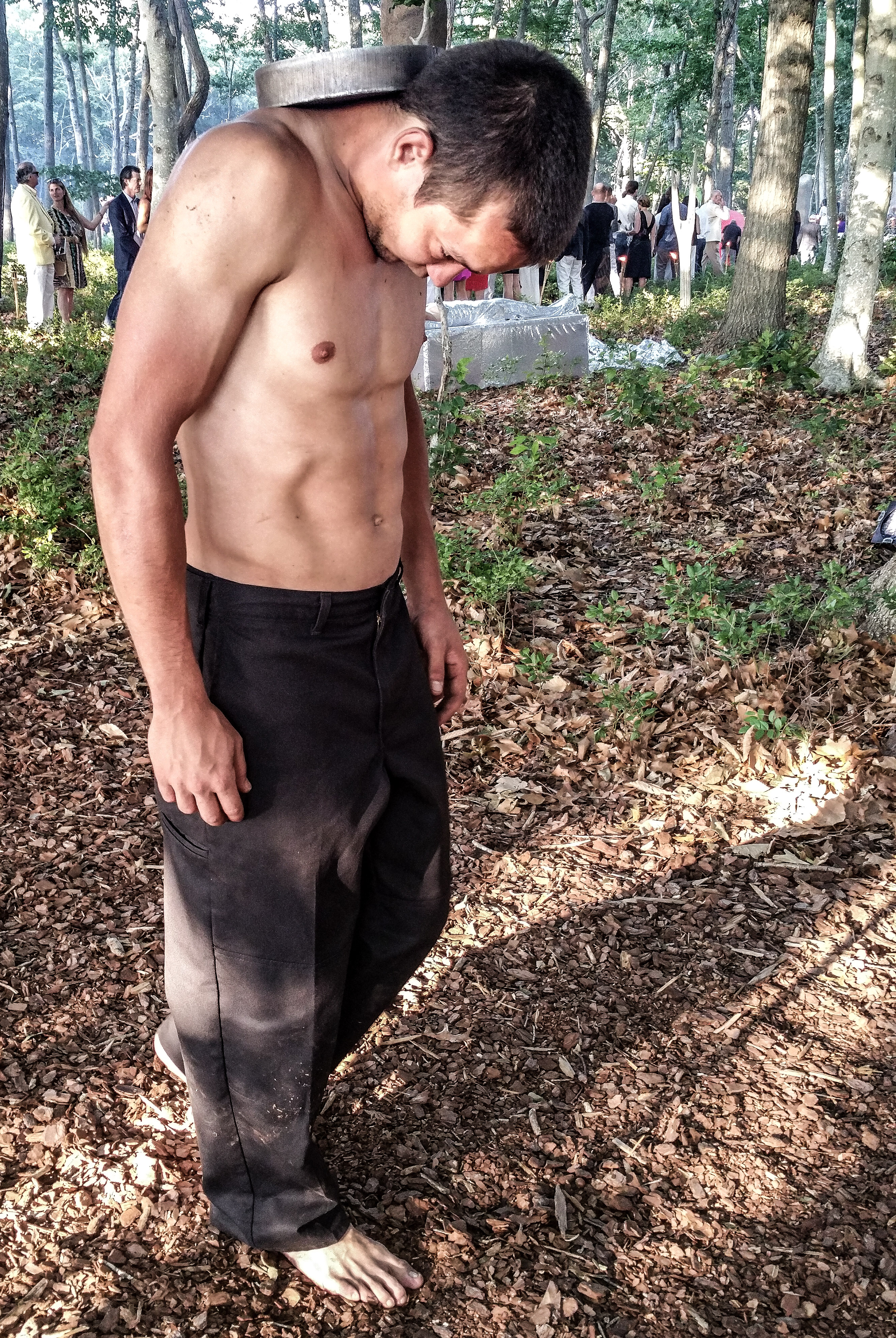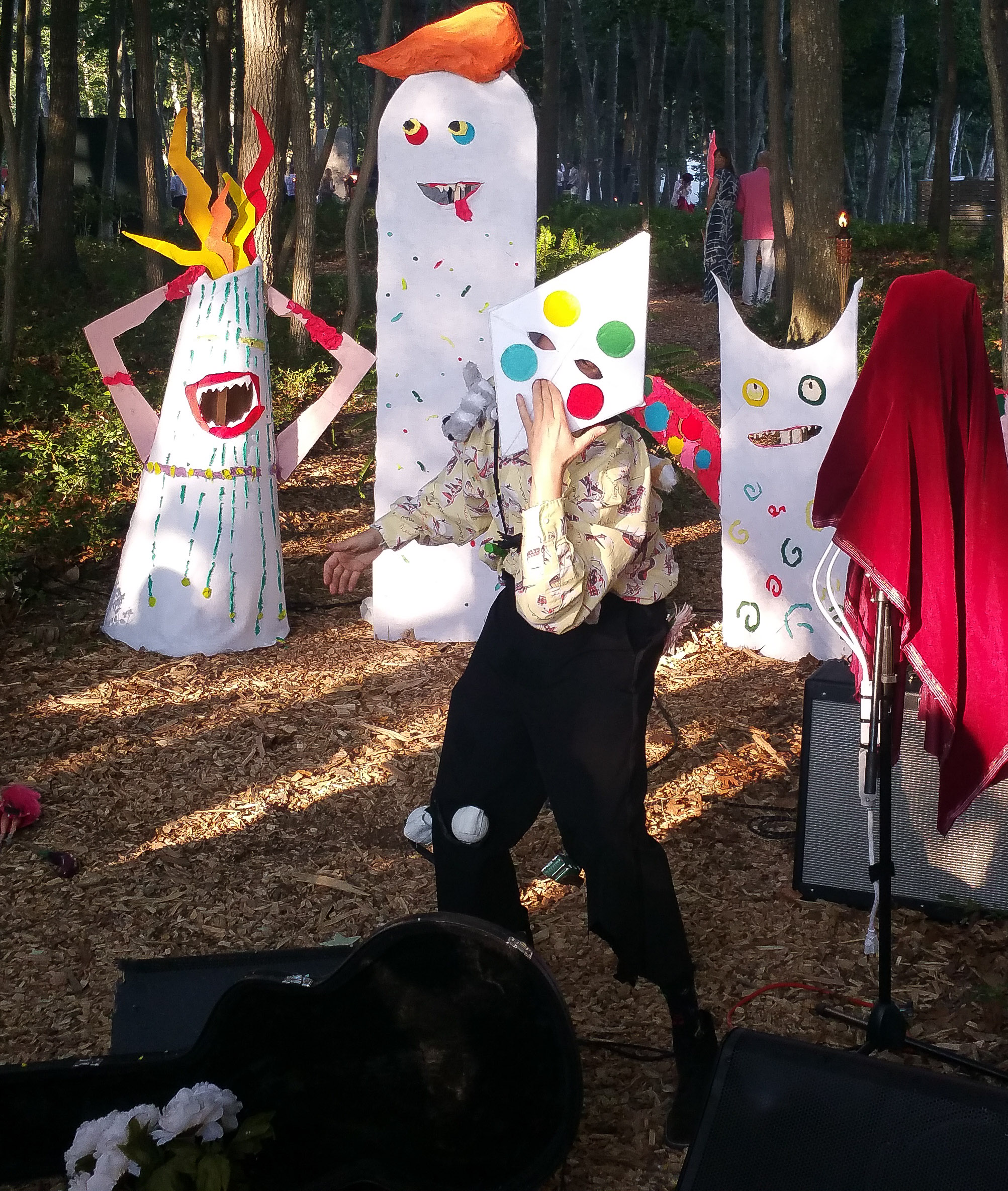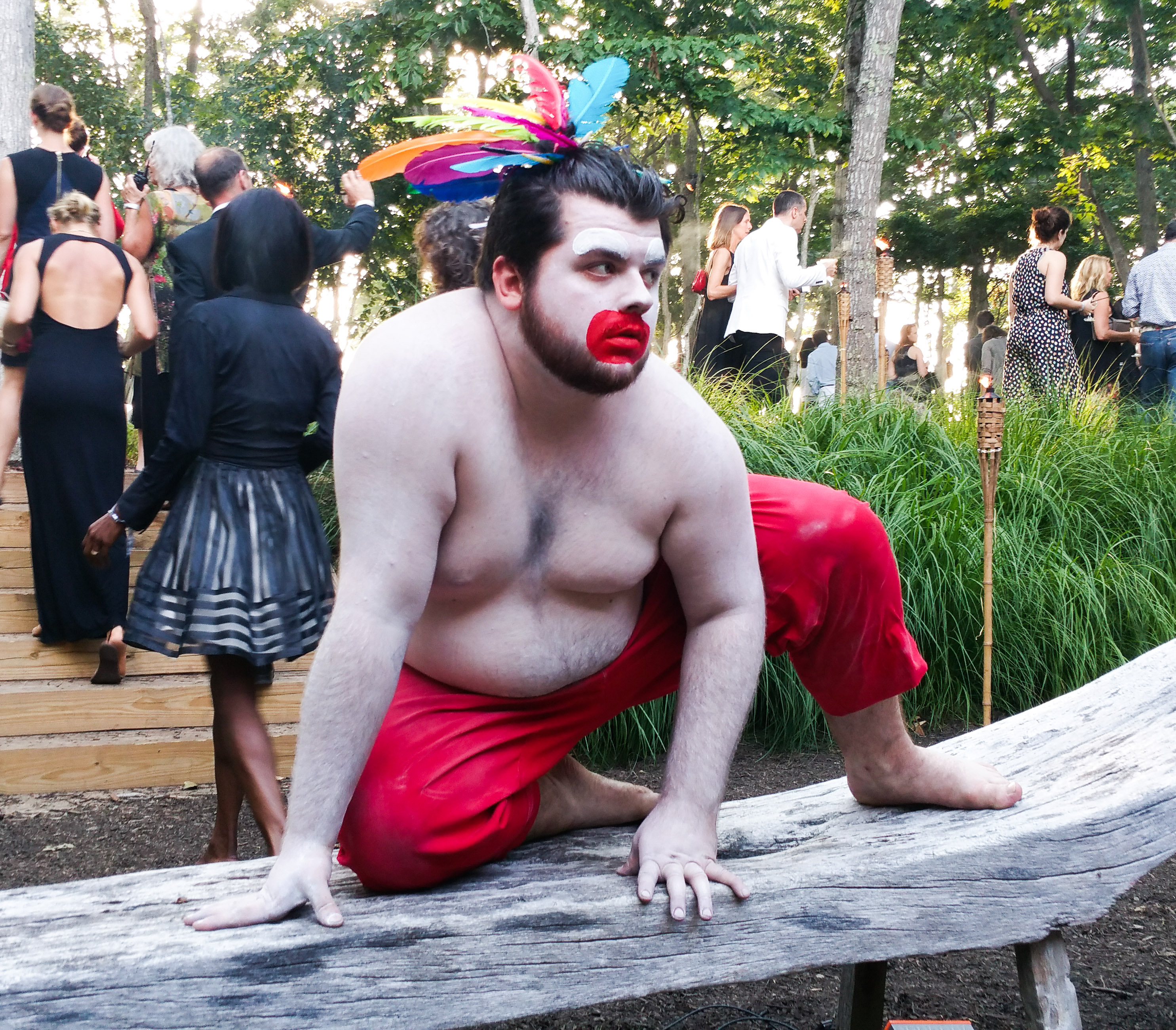 While passing through the woods and center grounds, attendees were offered cocktails and invited to view the works by artists including Cleon Peterson, Gary Garay, and Radamés ‘Juni’ Figueroa. In one work, men lay under a watermelon patterned blanket, while nearby a woman in tin foil watched, flanked by an over-sized polar bear sculpture, along with a spirited live performance by Sierra “Rosie” Casady of CocoRosie.