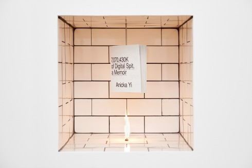 Similarly, and perhaps fittingly for a major early career museum exhibition, 7,070,430K of Digital Spit is also invoked as the title of the artist’s reprinted monograph, on view at the gallery. Printed on delicate, handmade paper, the artist invites any reader to burn the work immediately after reading through it, a quite literal death of the artist’s past work that also releases even more of the Forgetting scent into the gallery space.