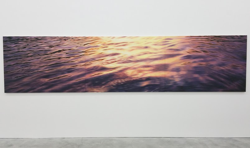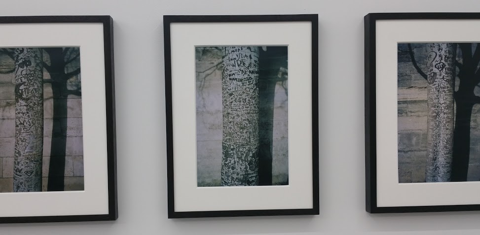 Continuing his exploration of assemblages and their human indexes, Greer’s work absconds to the Seine River in Paris, a context he establishes through the representation of its waters ablaze under a setting sun in yet another gleaming, large-scale, photo-realistic oil painting. A series of fondly-framed black and white snapshots which thoughtfully zoom-in on the details of nearby trees line the opposite wall. Each of the trunks is adorned with a carved inscription, presumably by a distinct, since-departed individual, substantiating the universal impulse to conquer ephemerality through concrete markings.
