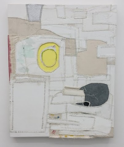 A series of collages, tenderly sewn together from swatches of canvas sweepings and subsequently personified through their titling– names including Cruz, Gregoire, Kevin, Valentin, Roman– adorns the outer rooms of the space. In these one can find what are ostensibly figurative depictions of the titled persons, made through the playful piecing together of scrapped art materials. The choice of medium and the memorializing of individuals speak again to the refreshing sensitivity of the artist, of his affection for what could perhaps be described as his own pastiche of confidants, and of his genuine engrossment with the subtleties of the human personality.