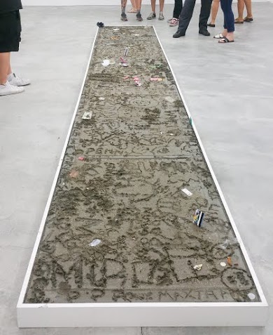 No piece, however, more forcefully validates the artist’s concept than the title work, a rectangular encasement of once-wet cement wherein the opening’s attendees inscribed the marks of their own presence. These visitors, acutely aware of their urge to catalogue their attendance, became living proof of the affinity of humans to join together in the contending of impermanence.