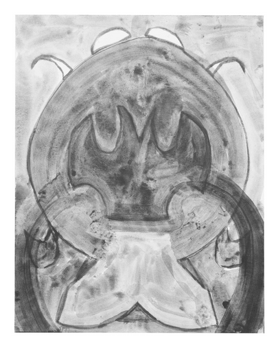 In others, the works are dominated by swift sketches and line work, with only momentary flairs of color that punctuate their quiet movement. But as much as these works draw from an attempt at avoiding direct cognizance in their realization, the pieces feel as much a rumination on texture and surface. The rough edges of pieces like Two Places at Once or He Swears feel as if they emerged from an almost obsessive repetition of action across the canvas, repeating gestures and strokes as the lumps of graphite and swirls of paint slowly cluster into large bodies, or run across the surface into blurry pools.