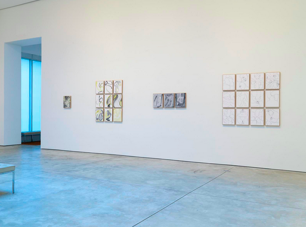 Taking cues from the “automatic drawing” of André Masson, Pierson’s work here unfolds at a rapid pace. Patches of graphite and watercolor cluster on the canvas, or run in streams across their surface, created in a rapid method that balances a certain abandon for coherence with a careful study in the interaction of color and line. The pieces often glow with energy, allowing large fields of color to play with perceptions of depth and space.