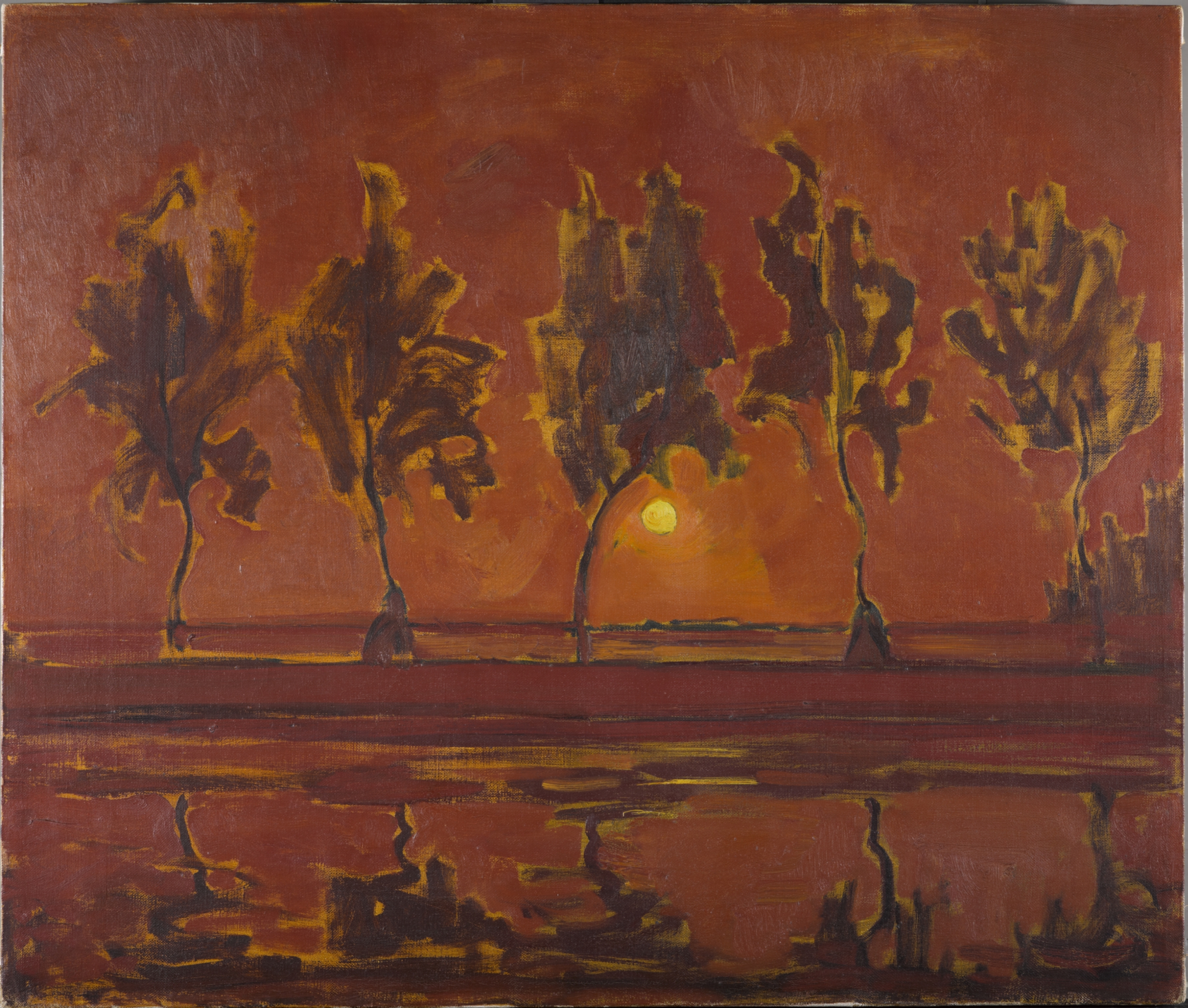 Piet Mondrian , "Fünf Baum Silhouetten an der Gein mit Mond," 1907, photo courtesy Martin Gropius Bau © Gemeentemuseum Den Haag, Nie-derlande