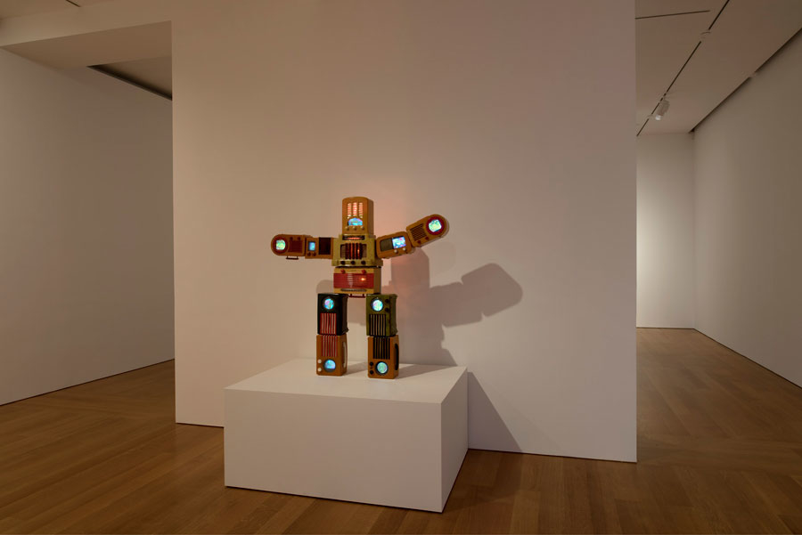Also on view is one of Paik’s robot sculptures, Bakelite Robot, which continues his interest in the anthropomorphic nature of his elements and material focus.  Turning his objects into quite literal representations of the human form, the artist makes explicit the interactions between the human mind, the human body, and the elements that facilitate broader linkages and networks between all three around the globe.