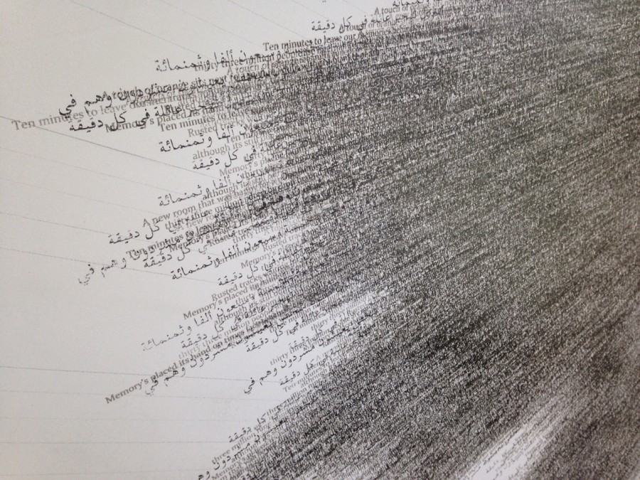 Requiring viewers’ close inspection to reveal their details, Khan’s elaborate creations are composed of texts – both in English and Arabic – penned by the artist himself. Widely positioned around edges, lines of text intensify through the center, evolving into profound shapes and clusters of phrases, before gaining a distinctly transcendent charm as the texts become gradually illegible.