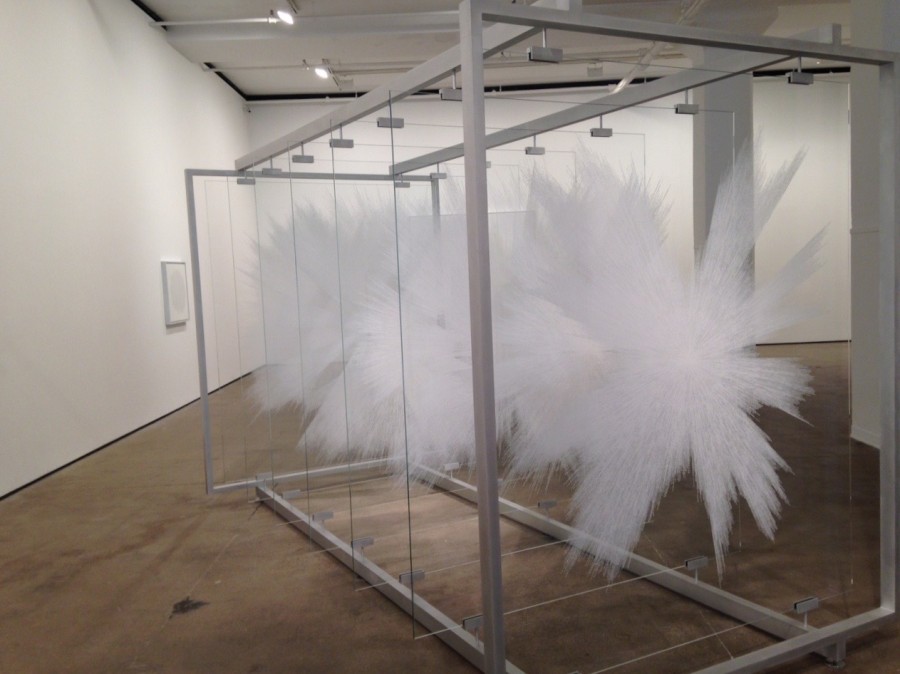 The main focus of the exhibition is Displacement, a large-scale, site-specific assembly of stamp prints that Khan manually applied onto the wall. Calling to mind an atomic explosion or a terrestrial formation, this impressive structure repeats itself throughout the exhibition, applied on glass panels or gesso, and delivering a variant constellation each time. In one section, the panels are strung up along a metal framework, giving an illusory, textured substance to the flat panels.