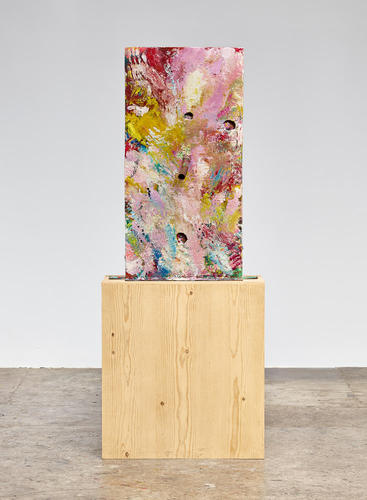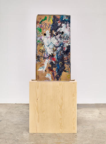 Twisting the formal language of both his chosen objects and the painterly signifiers he has built up over the course of his career, Mark Grotjahn returns to Anton Kern Gallery for his fourth solo exhibition with the New York Gallery.  Building on the sculptural objects presented last year at the artist’s exhibition at the Nasher in Dallas, the works on view take Grotjahn’s interest in cast-off materials and repurposed objects, the show turns the artist’s frequently reoccurring subject, the cardboard box, into a container for his own aesthetic interests.
