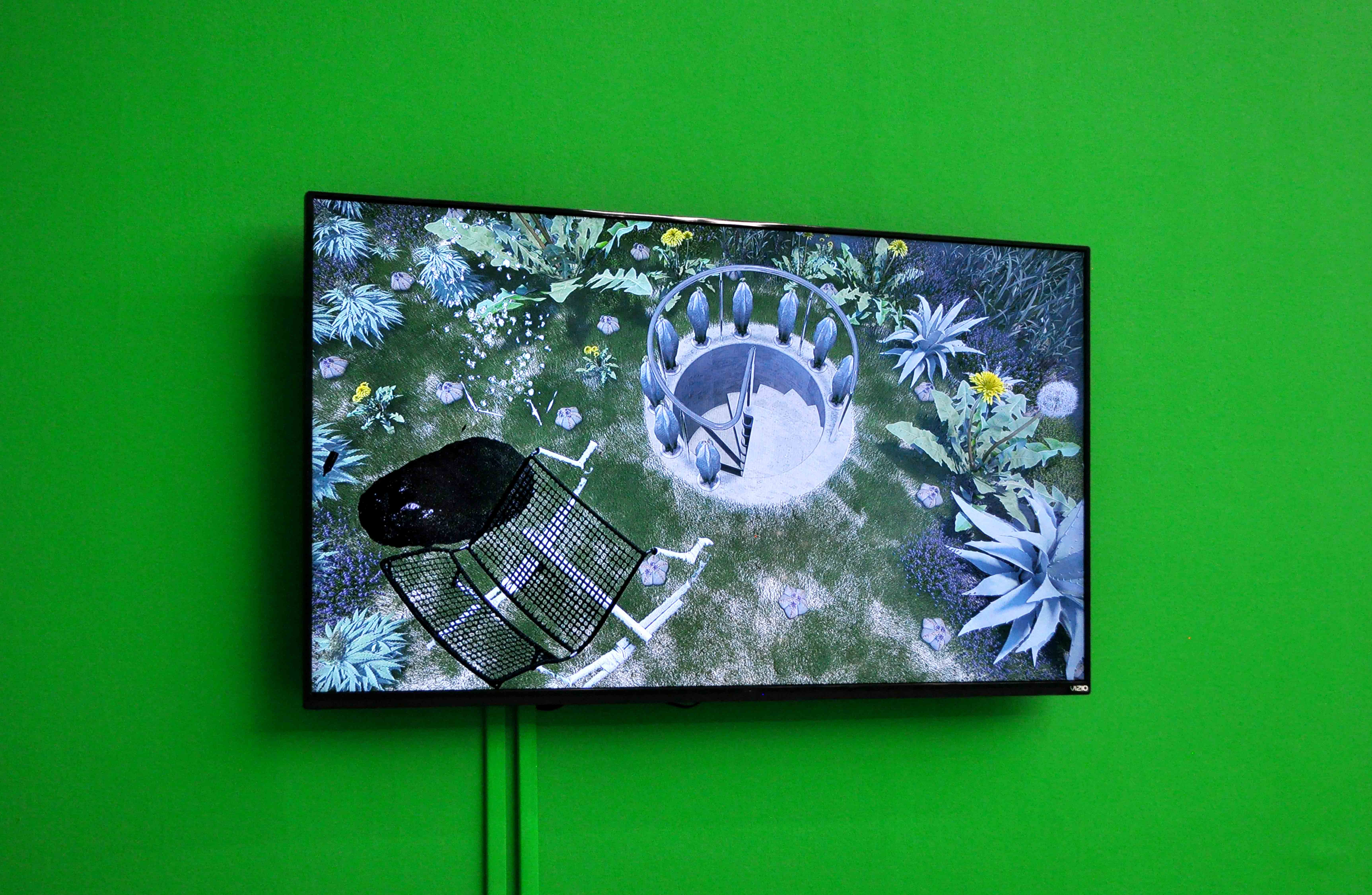 As previously mentioned, the viewer is immediately struck by the sharp green of the installation space, executed as part of artist Sean Maximo’s project for the space. Taking the provided furniture and visitors as part of his keyed-out video installs, Maximo then inserts the viewer in vastly different environmental designs, from otherworldly lunar homes to luxurious office spaces, always counterpointed by furniture sets and other objects that anchor the piece, to a certain degree, in present, concrete locations. The work effectively jumps light years beyond the more tangible objects in the room, proposing a speculative architecture where designs of today must contend with the landscapes of tomorrow.