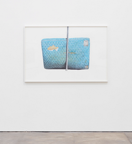 Continuing his practice of documentation and straight-faced appropriation of consumer-grade objects and spaces in his surrounding landscapes, the Metro Mattresses presented here stem from the artist’s systematic photographing of cast-offs dotting the L.A. curbs and street corners. Covered in dirt, stripped of their padding or leaning pathetically against walls, poles and signage, the objects offer a wealth of visual appeal, as the artist seems to savor in the recreation of these faded, chipped and creased objects. In one, a mattress lays against a solitary pole, while in another, it curls in on itself, folding as it slides down an unseen wall.
