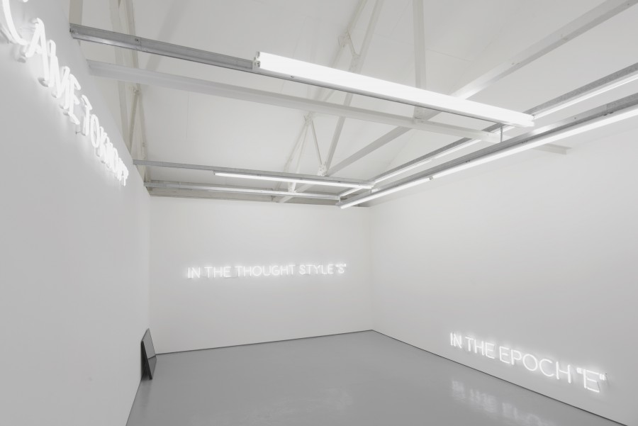 A broadcast from 1887 on the Subject of our Time, for example is a piece from 1996, employing a vintage radio broadcasting a text about radio broadcasting from a book written by Edward Bellamy in 1887, before this technology was invented. Next to such audial stimulation, Gillick introduces a text-based body of new works, adopting the striking allure of neon as linguistic element, pushing twists in language and perception alongside the droning radio work. Abstract textual inversions such as “IN THE THOUGHT STYLE ‘S’” or “IN THE EPOCH ‘E’” shine on gallery walls as a part of a new series that is appropriately titled Discussion Platforms. The works make much of their attempts to define spaces and containers for thought, as if a concrete, almost numeral application to language could create new spaces for perception or revolution. Either way, Gillick’s point towards this thought is perhaps enough to actualize it.