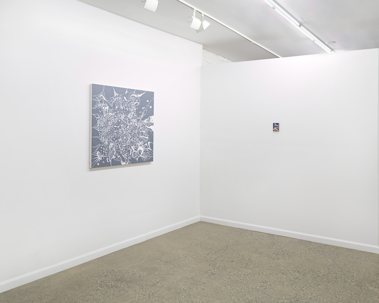 A colorful counterpoint to Man-Made Fibers is Patrick Meagher’s Whether Weather, an inkjet print of a bright sun overlaid on top of an umbrella (both taken from weather forecast icons) and a diagram of a cellular network. The corresponding work is a still life by Kuniyoshi, which depicts a small shovel and shells in a strange, floating juxtaposition. Meagher said he was inspired by Kuniyoshi not only for his aesthetic work, but also his social practice and work organizing support systems and opportunities for other artists. CalyMayor and Kelly also have a social component to their practice. The three artists have been heavily involved in artist-run exhibition spaces and have worked together organizing CollectiveShow.org, a recurring group show for artist collectives and artist-run spaces. Kelly is also a founder, along with Andrew Gori, of SPRING/BREAK, a curator-focused art fair taking place during Armory Week.