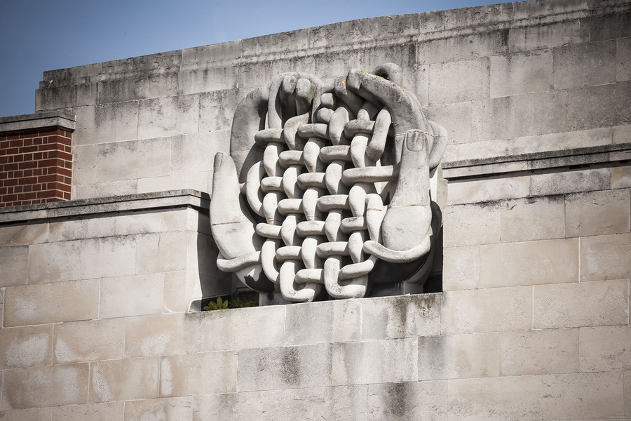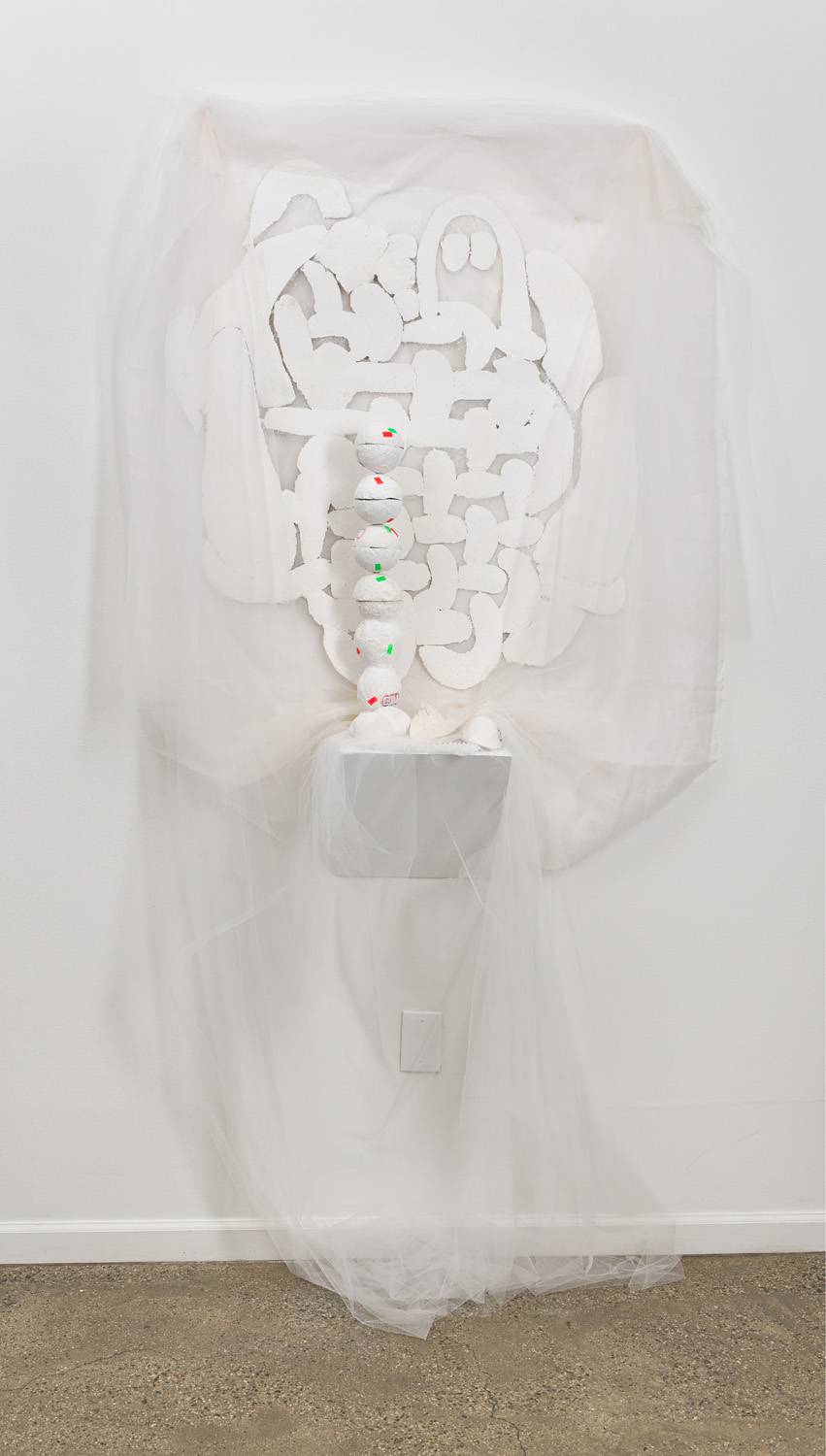 Alva CalyMayor’s whimsical Man-Made Fibers is a sculpture made from paper pulp and tulle, delicate and ethereal with a few comical punctuations like fluorescent orange price tags. It is directly inspired by two of Mitzi Solomon Cunliffe’s works, her design for the BAFTA award and a stone relief from which CalyMayor took the name, Man-Made Fibres.