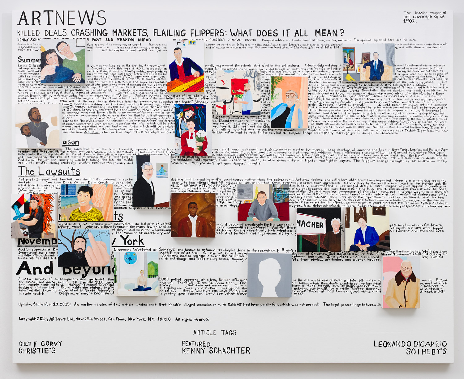 Next to Lee’s piece is Ambre Kelly’s What Does It All Mean? Flippers, Markets and Deals, a cartoonish rendering of a page out of ARTnews, dotted with portraits of art market players (and Leonardo DiCaprio). Kelly found her work resonated with the portraiture of Lily Harmon, who painted friends, relatives and acquaintances in the art world, with her body of work coming to be a representation of a certain social milieu of the time.