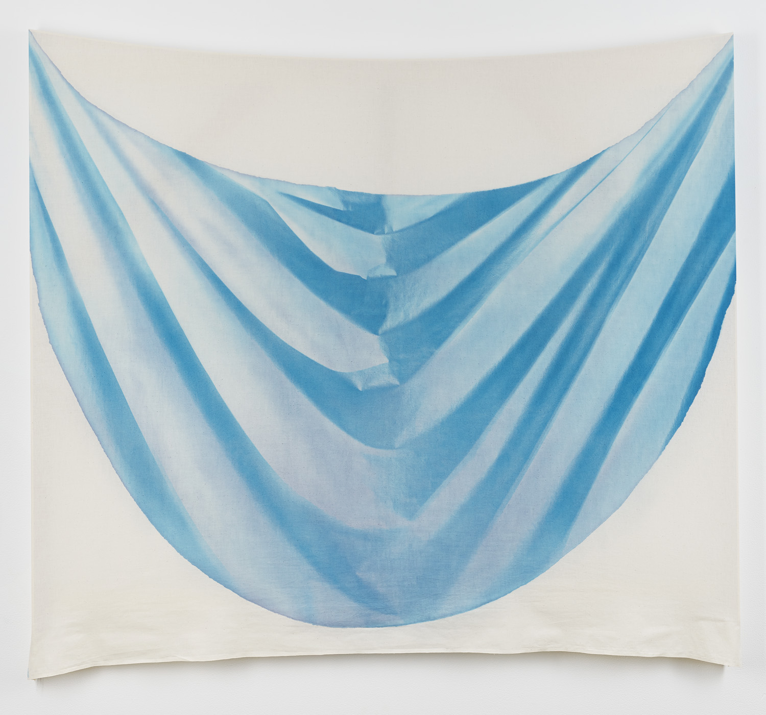 Karen Lee’s Drawn On is a tromp l’oeil cyanotype drape on draped muslin. Lee chose a particular painting, Herman Maril’s Form and Flow (1958), a spare and almost abstract somber seascape with draped rope and fabric, as her inspiration. Somewhat of an outlier regarding Maril’s work, Lee was drawn to this painting because it “seemed like it could be a blueprint for [her own work] to a continually canny degree.”