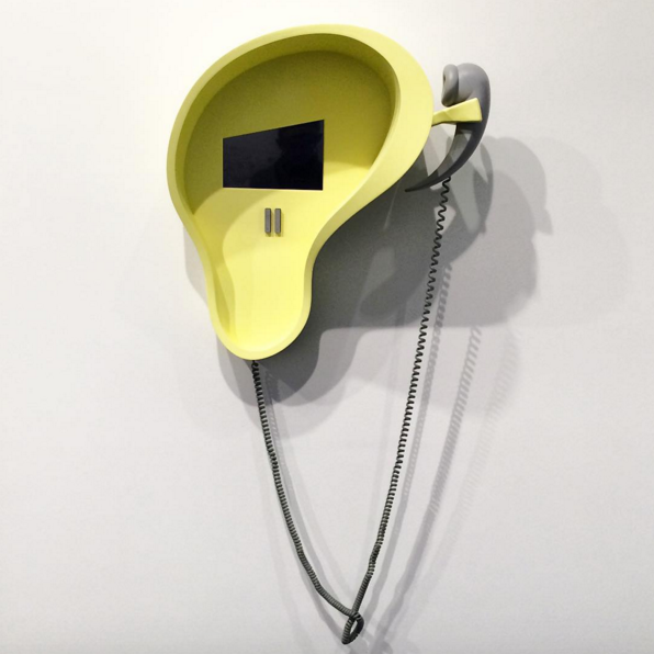 The exhibition begins with a spare, white gallery, adorned with a series of interactive phone sculptures. In each, video and audio present fragmented storylines and poetic inflections, occasionally inviting viewers to select one of two options in fraught, garbled narratives in the style of phone-in hotlines. Yet as much as the viewer seeks to make sense of the pathways Henrot allows in her works, the pieces often come disturbingly close to the viewer’s own emotional ground. Asked to choose between options implying spurned lovers, manipulations by pets, or senses of abandonment, the viewer’s choice occasionally triggers a sudden self-reflection, as the absurd question conjures a deeper analysis as to why one relates to these absurd propositions. In others, Henrot shows video from live chat feeds, including one in which a man repeatedly blows smoke rings on camera. The distance afforded the viewer from the conversation itself makes the video both comically distant and strangely voyeuristic.