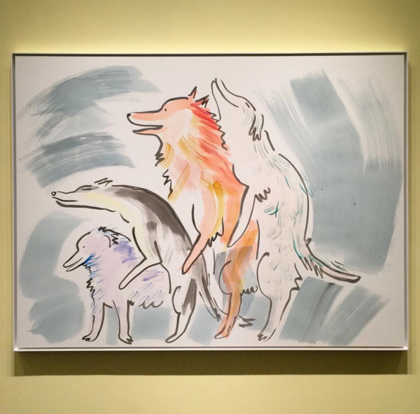 One room over, the artist is showing a series of her sexually-charged, yet cartoonish, surreal drawings, featuring animals and humans in often intimate relationships, while others depict bizarre, distended bodies, including one work showing a suited executive devouring a pair of human legs. Placed alongside another of the artist’s phone sculptures, the work feels tenuously tied to her previous sculptures, while moving into a more explicitly visual turn on the same sense of human experience held at an abstracted distance.