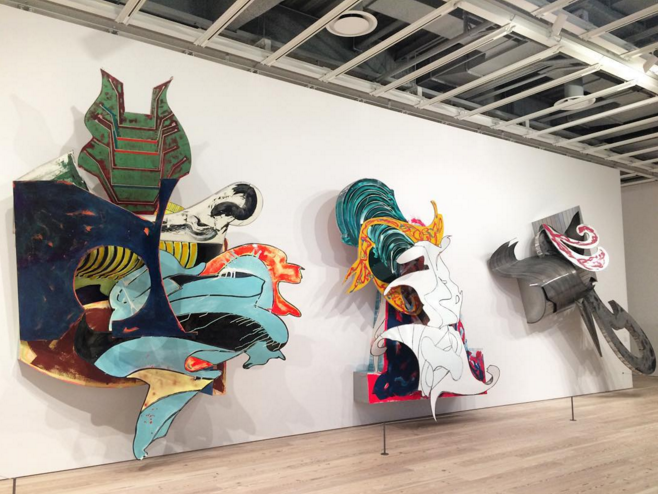 Stella’s work is at turns brusque and fluid, or rigidly concise, exploring various turns not only in the perception and expression of raw formal elements on canvas and sculpture, but the potential shifts in perception lent to a surface by thick, rough coats or a thin, air-brushed gradient.  As much as the pieces explore the intersections of depth and space, the relationship to viewer is almost constantly foregrounded.  Works lean out towards the onlooker, or twist inwards, inviting a spectator to move more closely to the work, and peer into its recesses.   The artist’s interest in the classical avant-garde is also a particularly interesting note here, particularly in consideration of his most recent works, particularly one far wing, where viewers can compare the miniatures of Circus of Pure Feeling for Malevich: Four Squares on view looking out over the Hudson River with a number of his other recent, and much more substantial pieces.  The comparison of scales only makes the shared interest in flow and movement all the more compelling.