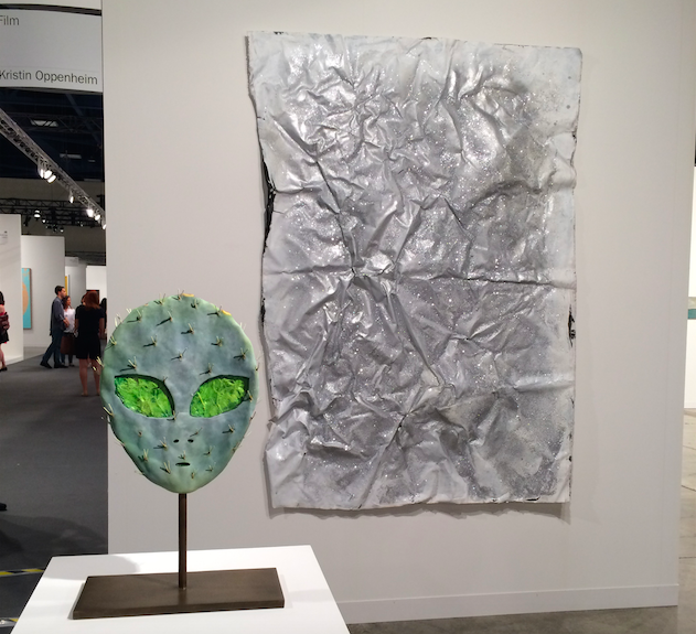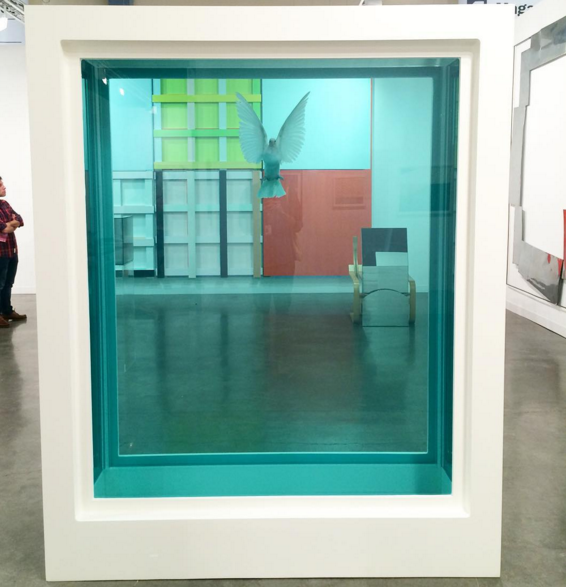 Skarstedt Gallery had scooped up prime real estate near the entrance to the fair, and was showing a broad selection of pieces, including paintings by David Salle and Albert Oehlen, as well as a burnt-orange Mike Kelley tapestry.  Close by, Peter Freeman had one of the more eye-catchingly peculiar sculptures in the fair, Jimmie Durham’s Still Life with Xitle and Spirit, which placed a massive volcanic rock (with a cartoonish face painted on its surface) atop a crushed sedan, commanding attention from attendees, who frequently stopped to photograph themselves with the comically disastrous scene.  In another corner, Hauser and Wirth was showing a series of works by Philip Guston, including a pristine 1969 canvas that sold for $300,000.  At White Cube, the gallery had brought a massive Damien Hirst formaldehyde, which placed a single dove, wings spread, in suspension.  Gagosian also brought a strong booth, including a number of loosely-executed Roy Lichtensteins that made it an early destination for eager collectors.  Pace Gallery also set an impressive tally, moving 16 Louise Nevelson works in the fair’s opening hours, priced from $75,000 to $1 million, on top of strong sales for Maya Lin and Agnes Martin.