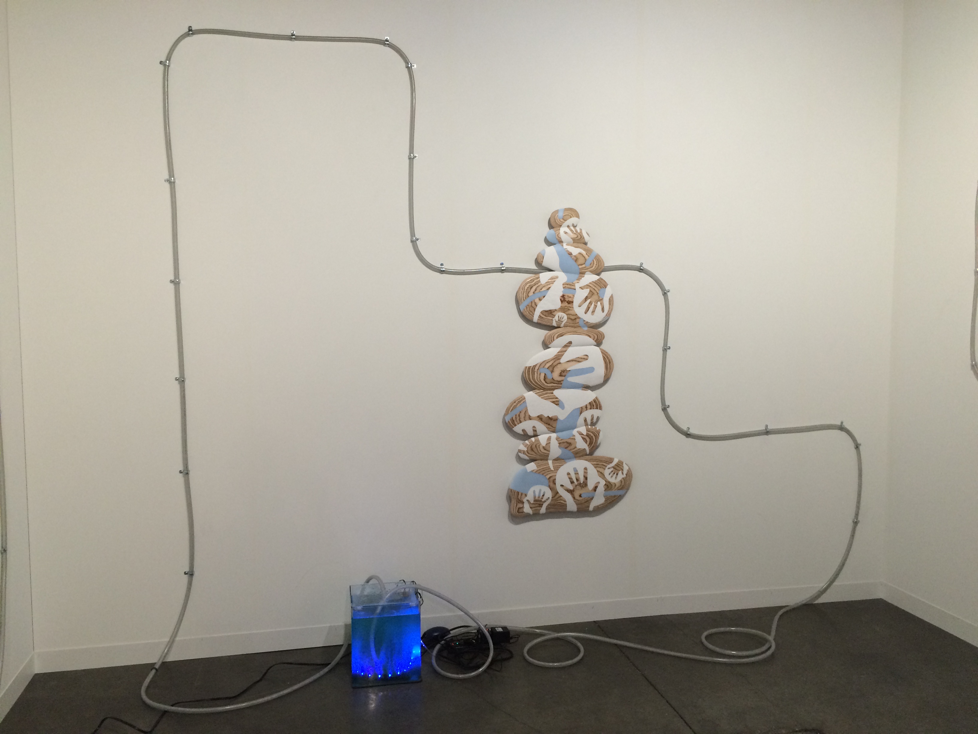 At the Nova section, a series of imaginative booths from LES galleries commanded strong attention.  Cameron Rowland, whose stark, politically tense pieces conjure conflations of the mass systems of capital flow and the subtle structures of power that they often create were a highlight of MoMA PS1’s Greater New York show earlier this fall, was showing a new series of pieces at Essex Street.  The works, combining simple appropriated documents and massive steel cables, also carried a sharp critical bent.  Nearby, fellow LES mainstay 47 Canal was showing a series of works from Antoine Catala, including a strange, inflating and deflating sculpture, placed on a curved tabletop.  Across the aisle, Ramiken Crucible’s exhibition of works by Lucas Blalock applied the artist’s techniques towards an full-booth install, where prismatic sculptures sat in chairs, seemingly viewing the large photographs of hot dogs on each wall.