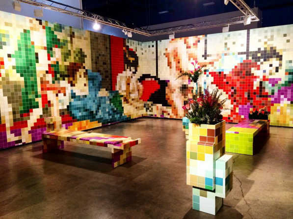 At Fondation Beyeler’s reprised booth in the corner of the fair, artist Tobias Rehberger had installed a full-booth mural, translating a series of erotic scenes into a tiled wall piece, breaking the composition down into a colorful, blocky work adorned with flowers, comically playing up the pixelated images while drawing subtle references to early Roman bathhouse mosaics.