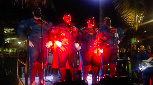 This evening, the fair’s Public section also opened, featuring a series of performances and activated installations that breathed a second life into the sculpture park just outside the Bass Museum.  Topping the exhibition was Xavier Cha’s Supreme Ultimate Exercise, which placed a Tai Chi master performing focused, controlled movements throughout the fair as a set of muscular men hammered on tires nearby.  In another performance, William Pope L. presented one of his superman-themed works, showing a quartet of blackfire supermen singing “America the Beautiful,” an ominous piece that felt equally comical and dark in the face of the country’s racial tensions and bursts of violence.