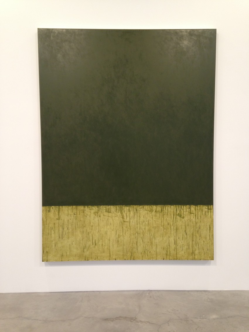 Even so, ties to the East are still noticeable here, both in his more reflective, wandering compositions and his blocky, vivid monochromes. Eastern Moss, for example, a nine panel monochrome painting, introduces terre verte — an earthy form of green that was commonly used in Medieval and Renaissance paintings to undertone flesh colors — a selection that not only vocalizes Marden’s return to Roman and Greek techniques, but also encapsulates his reconciliation with geometric, singular forms. Applied across a combination of nine variations on the green tone in each panel manages to emphasize each in turn for its particular captivating aura, while emphasize a pair of single-panel monochromes utilizing similar colors, and which claim a central presence due to the sporadic paint drips emerging on the lower parts of canvases.