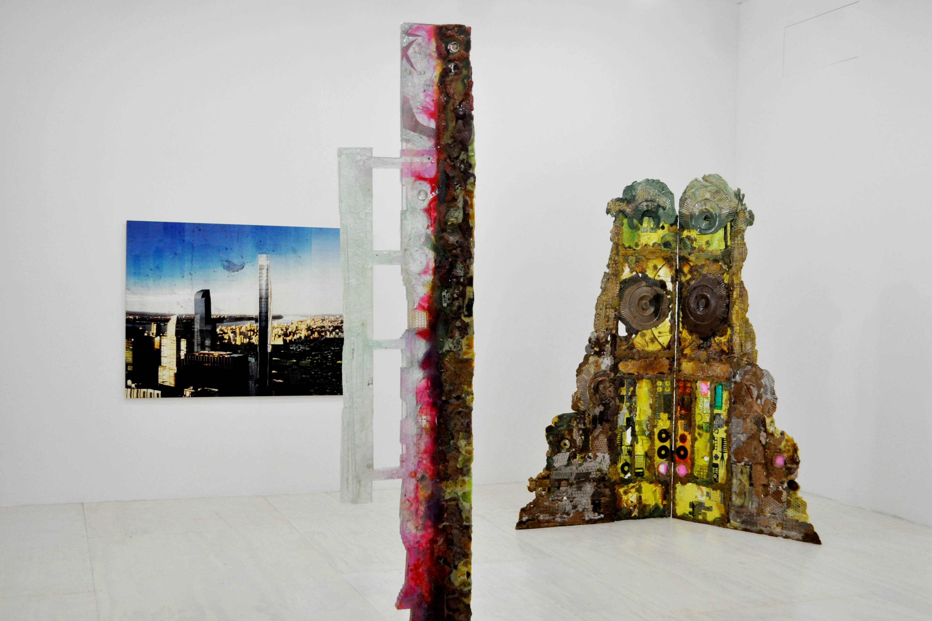 The exhibition takes an interesting course in the progression of works and artists on view, moving through a series of themes and variations as the show moves up from the basement, where artist Lionel Maunz’s dark, twisted sculptures take his background growing up in a family of doomsday “preppers,” and bends it through a vocabulary focused on human form and material detritus, carrying occasional inflections of Jeff Koons’s works from Equilibrium.