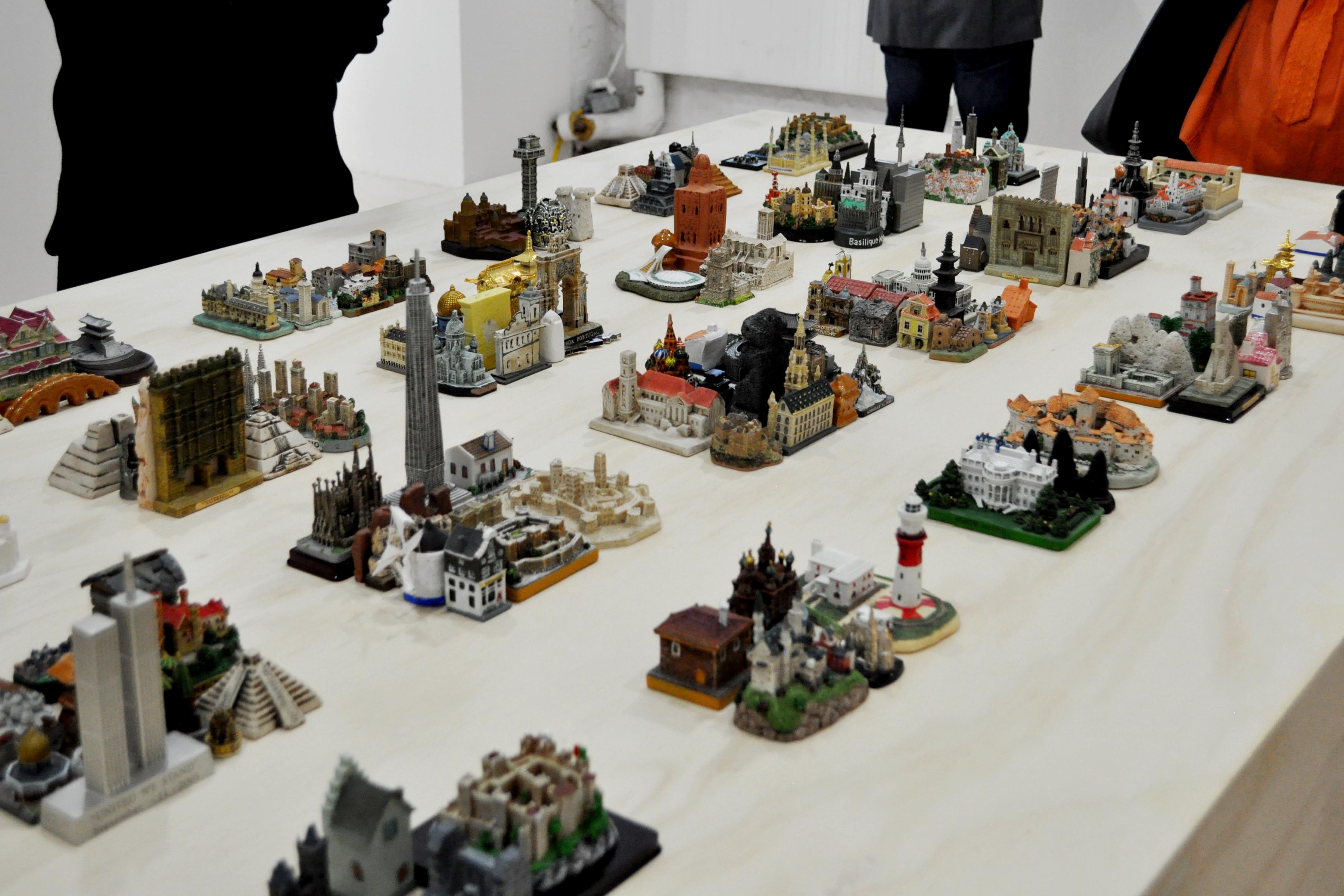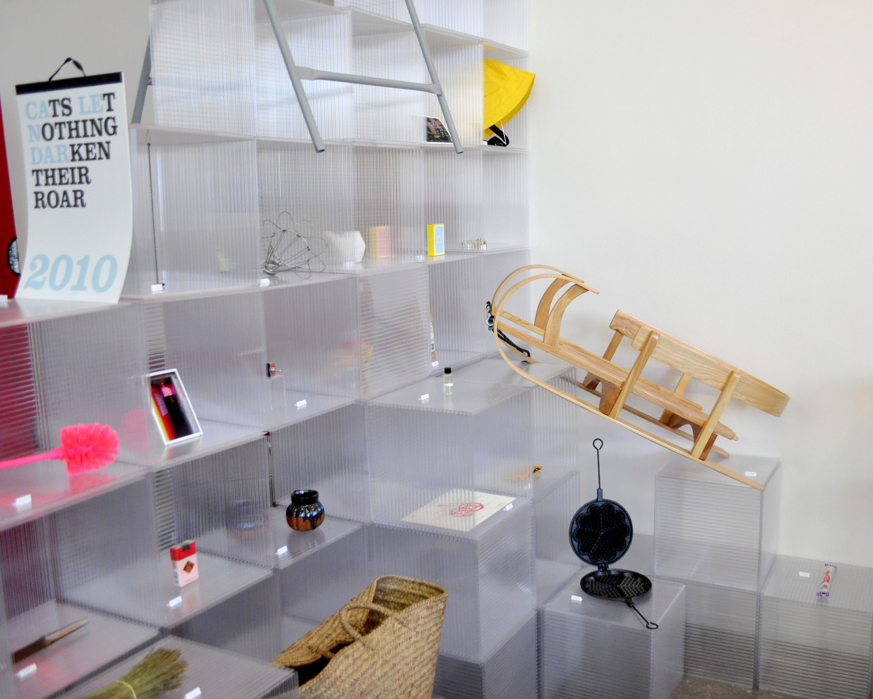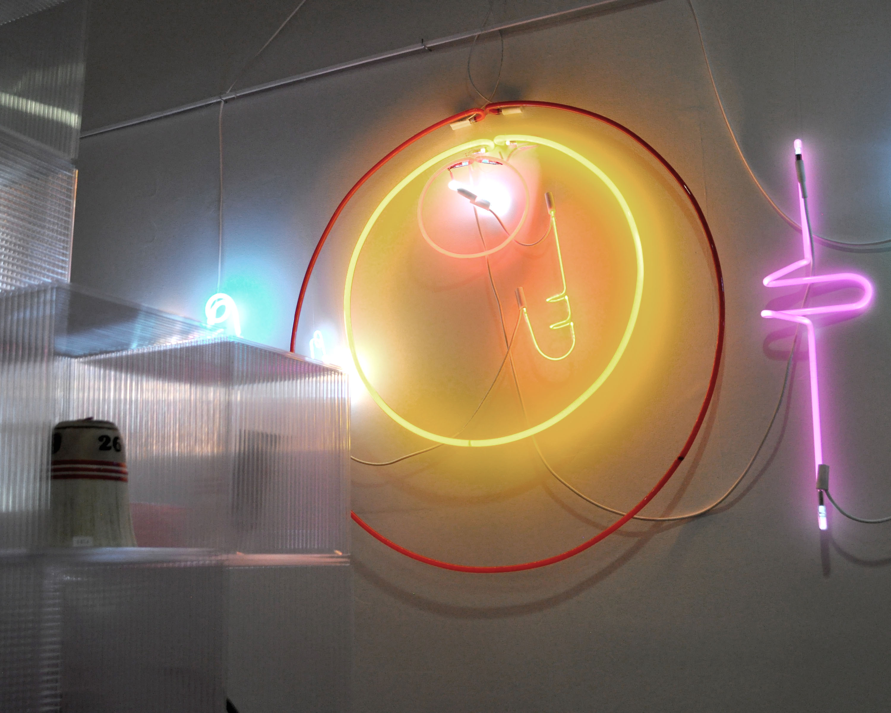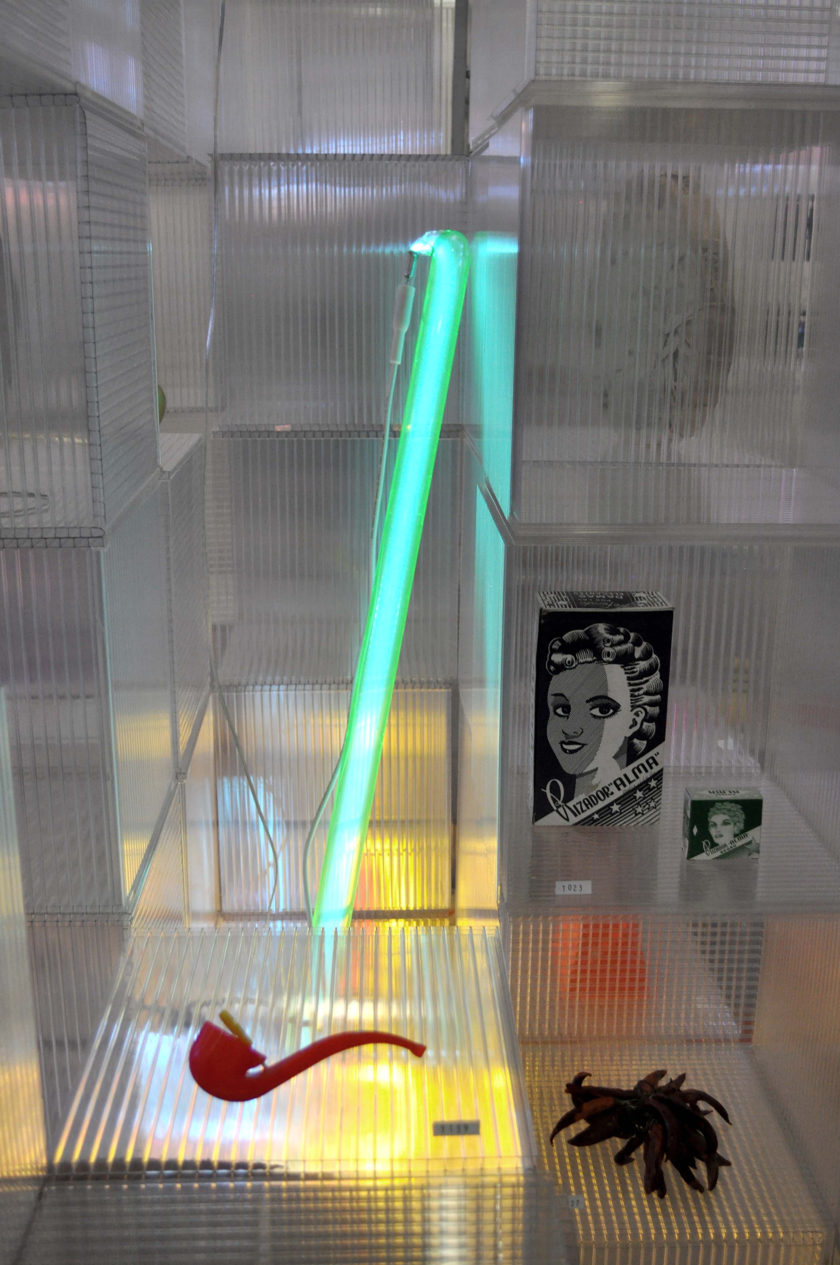 As the show progresses, a number of variations on these themes continue, branching into the city’s inextricable intersections with commerce, finance and trade.  These elements appear in vastly divergent threads, from interests in trade and exchange formats to the city’s perpetual role in the world of high-fashion and commodity commerce.  Several designers and even a few concept shops are represented, including Slow and Steady Wins the Race, whose diverse design concepts paired well with some of the digitally-focused works on the ground floor, wrapped in a circular display rack that took as much interest in materiality as display.  In two rooms on the second floor, concept shop KIOSK was displaying an archive of objects the store, run by Marco Romeny and Alisa Grifo, has collected or sold over the years, arranged in a vibrant, glowing series of neon-lit plastic cases.