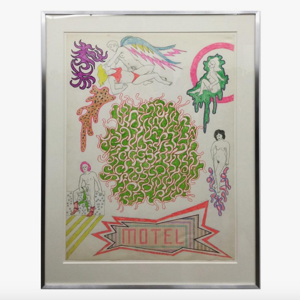 Throughout, the work’s fascination with sixties kitsch makes for a confounding interaction with the more counter-cultural elements depicted in his works. For all the sexual content and subversive material that may have shocked viewers during their early showings, the pieces on view here are perhaps more notable in the present for their choice of adornment, often drawing on the loose, zooming hand and pastel-soaked color palette of commercial imagery from the era, as well as the now considerably dated textiles and flooring samples he often uses as his central compositional forms.