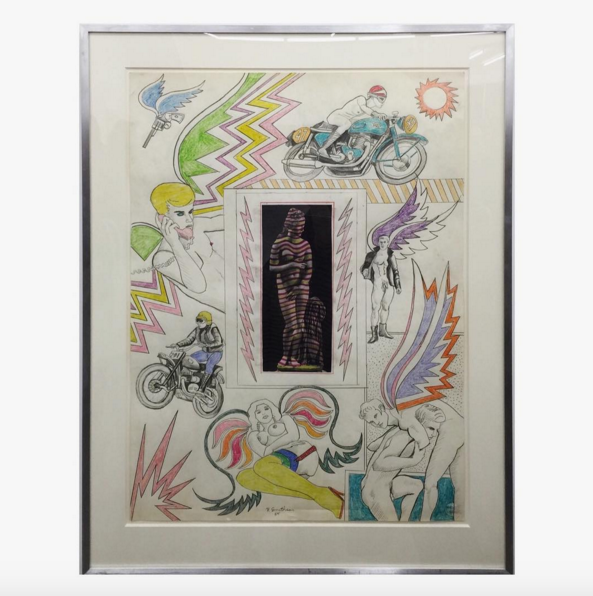 Robert Smithson, Untitled [Zig zag star center, motorcyclist with wings, and microscope with wings] (1964), via Rae Wang for Art Observed