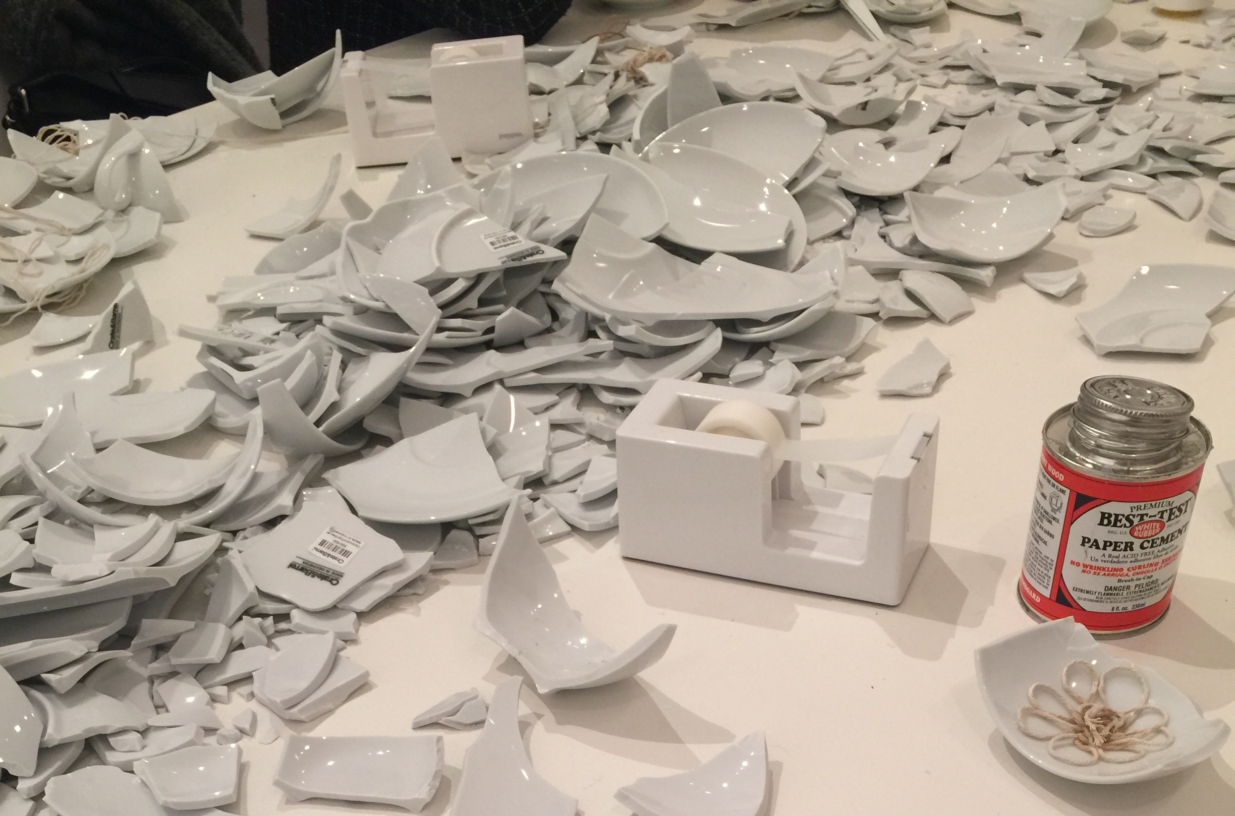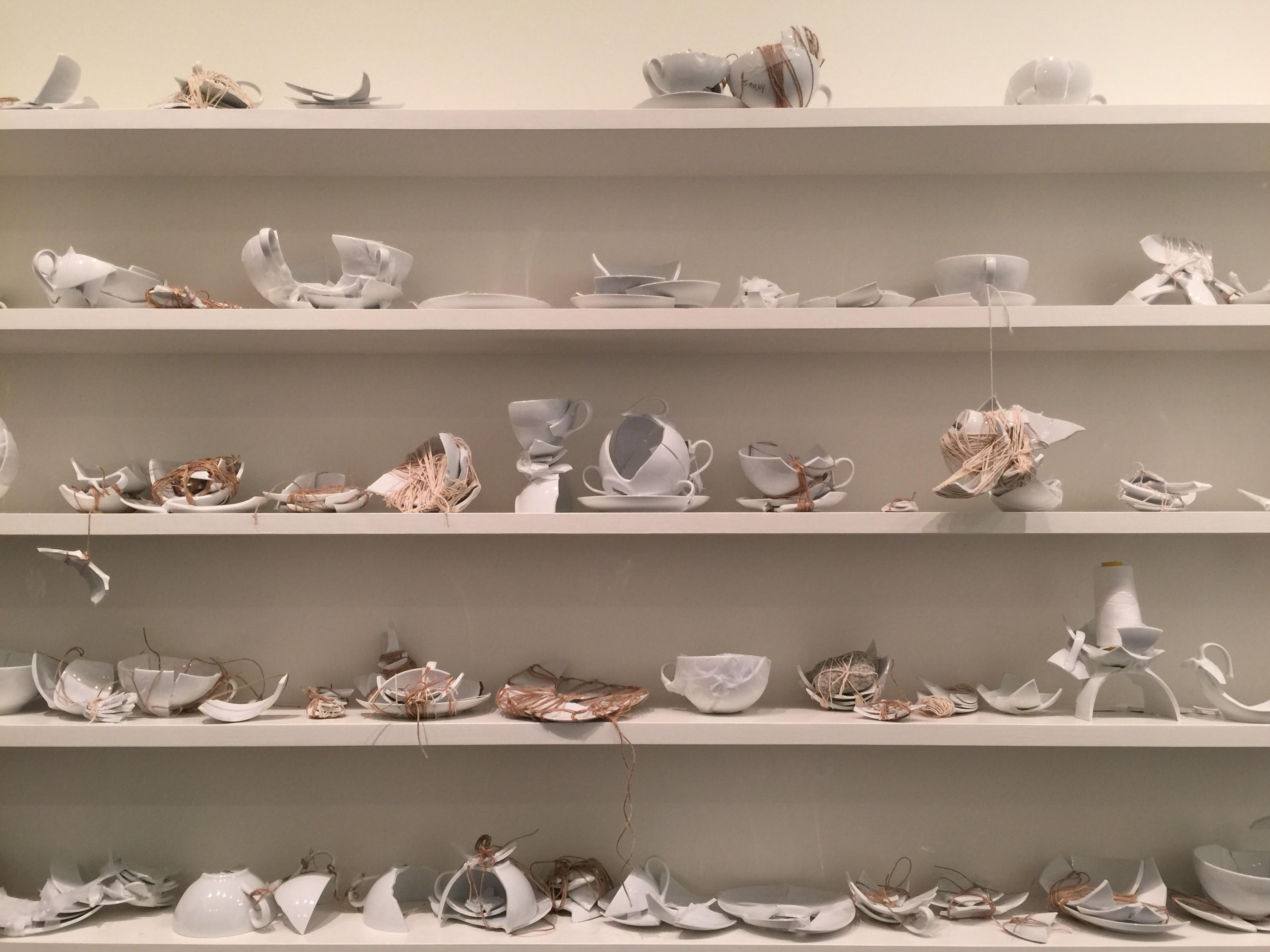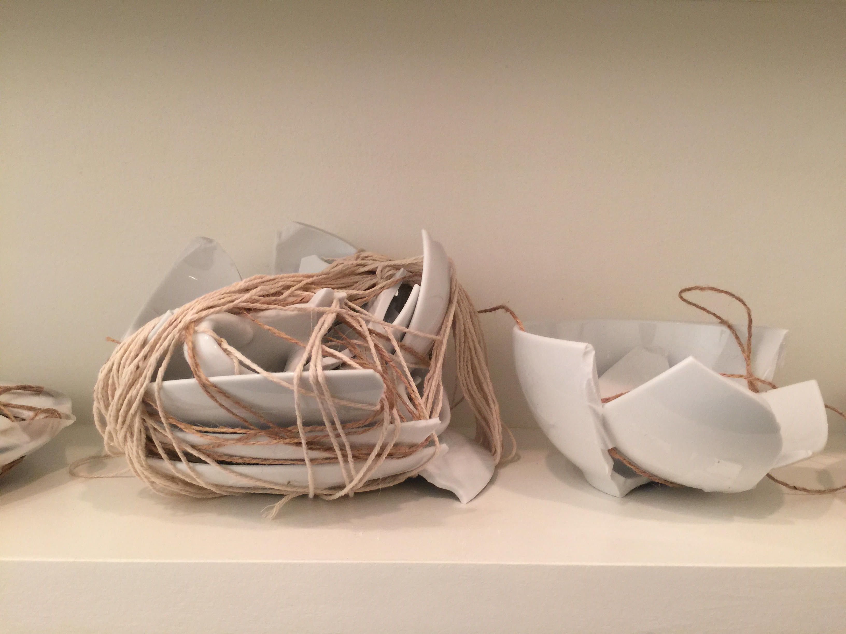Along the floor of each space, a pile of stones spreads as viewers pick up various river rocks in contemplation, while the work of an adjoining room centers around a table covered in shards of broken mugs. The viewer is encouraged to piece together these shattered ceramics using the glue, tape, and string provided, with reconstructed cups displayed on the shelves lining the walls of the room, representing the small steps toward a collected effort to mend the world, originating from a work she created following the tragic events of 9/11.