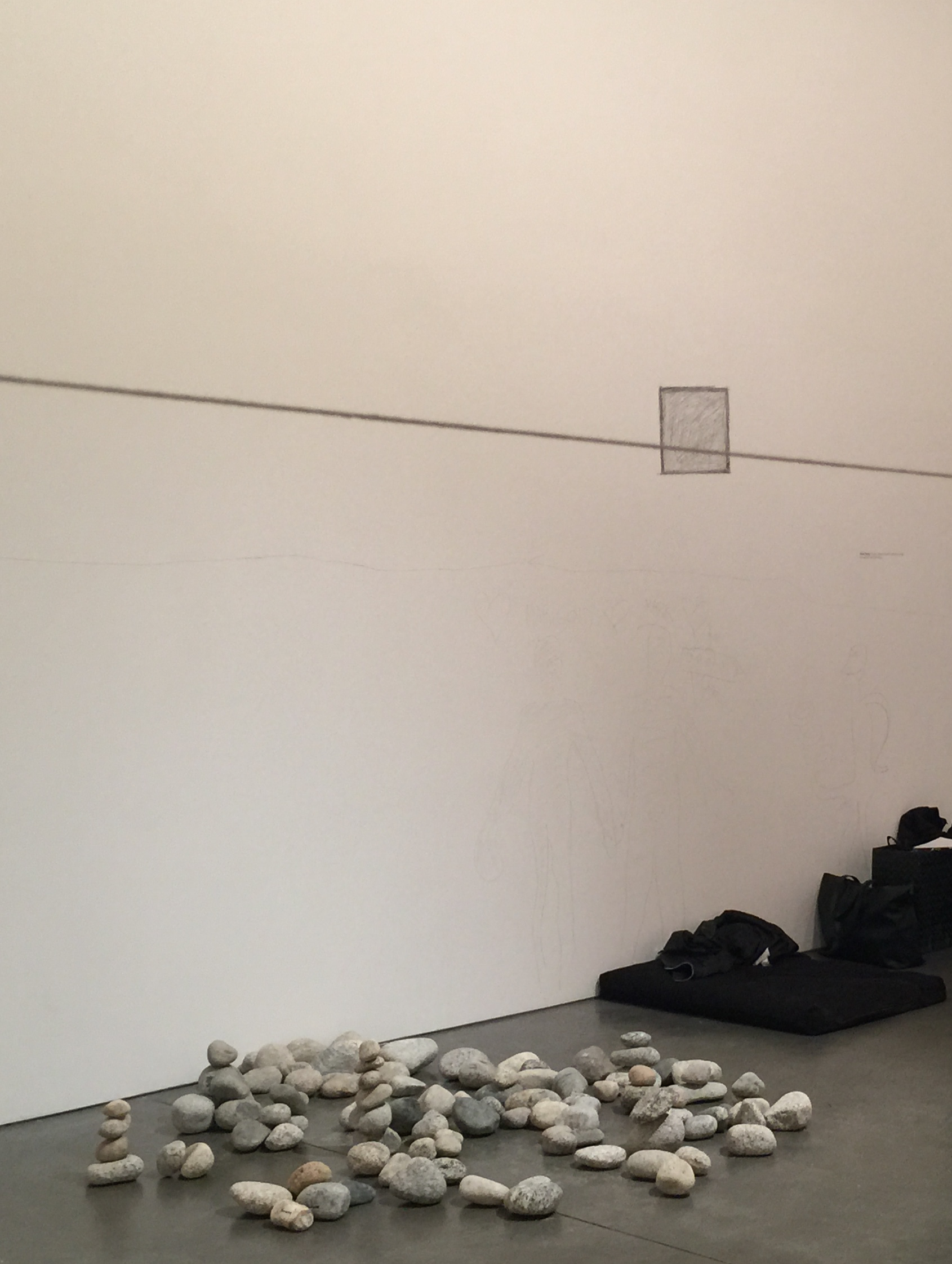Spread across two gallery spaces, Yoko Ono’s THE RIVERBED demonstrates the possibility and presence of basic human connection through the manipulation of various materials. Together, the assemblages of stone, string, and ceramic create a process of healing through, as the artist says,”love, and creativity.” This concept of mending is both internal and external, as string criss-crosses the space of each gallery, continued through pencil and paper on the sketchbooks provided.