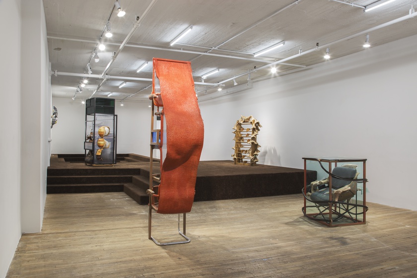 Reaves’ works are wildly constructed, drawing on plywood, sawdust, foam, wood, car parts and plexiglass, often complemented with finishing touches like silk, leather, zippered covers and glass. They are, to some degree, an unassuming set of elements, applying found materials and pieces in conjunction with her own sculptural embellishments. Irrational and imperfect, their human scale and materials reference historical and archetypal forms, their compiled pieces and parts unifying in a grand operation that mixes together varied concepts and histories of both labor and design. Reaves replaces stylistic details one might otherwise associate with craft, such as carving, inlay, exotic wood grain, joinery or tufting, with her own methods and flourishes, pulling together a range of ideas into a shared space. Drawing on different skills and concepts utilized by craftsmen in the production of furniture and other hand-built goods, Reaves’s work approaches the object as the summation of its historical notes. In one corner, a cabinet structure bears a series of cartoon mascots, both referencing a sort of working class analog to the high-art context in which the piece is exhibited, and simultaneously providing an aesthetic embellishment that pushes the work into new zones.