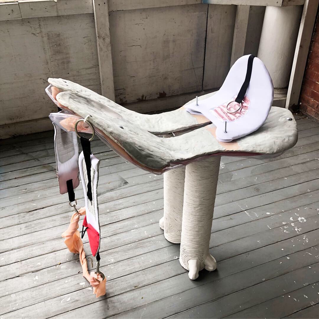 The show prioritizes flow and movement in a space that shows only a small selection of works from room to room, resulting in a presentation that presents as much as a group show as it does a fair environment. Objects and pieces open up onto others quickly and smoothly, emphasizing a collaborative structure as much in organization and thematics as in shared space. In one room, artist Erik Frydenborg’s surreal sculptural objects mixed together varied fiber elements to create a series of objects that gave the impression of a living animal, while Tony Pedemonte’s wrapped fiber sculptures, referencing furniture design, offered a parallel take on fiber work, albeit one that twists the familiar forms of “craft” on its ear. Anya Kielar was presenting a series of colorful paintings in one room, courtesy of Rachel Uffner, which offered a striking counterpoint to the work of Bailey Scieszka in the What Pipeline space, both populating human forms with contrasting markings and inflections that mixed together diverse elements of modern art history with a distinctly contemporary sensibility. LTD Los Angeles was also presenting unique works, a body of sculptures by Ilana Savdie perched on the porch of the house, and taking their own turns on the concept of furniture and utility through their inversions of form and the body. Zach Martin’s work at Fisher Parrish, was a fitting complement, a smoother, flowing approach to sculpture that nevertheless seemed to pull in references to modern design and architectural sensibilities.