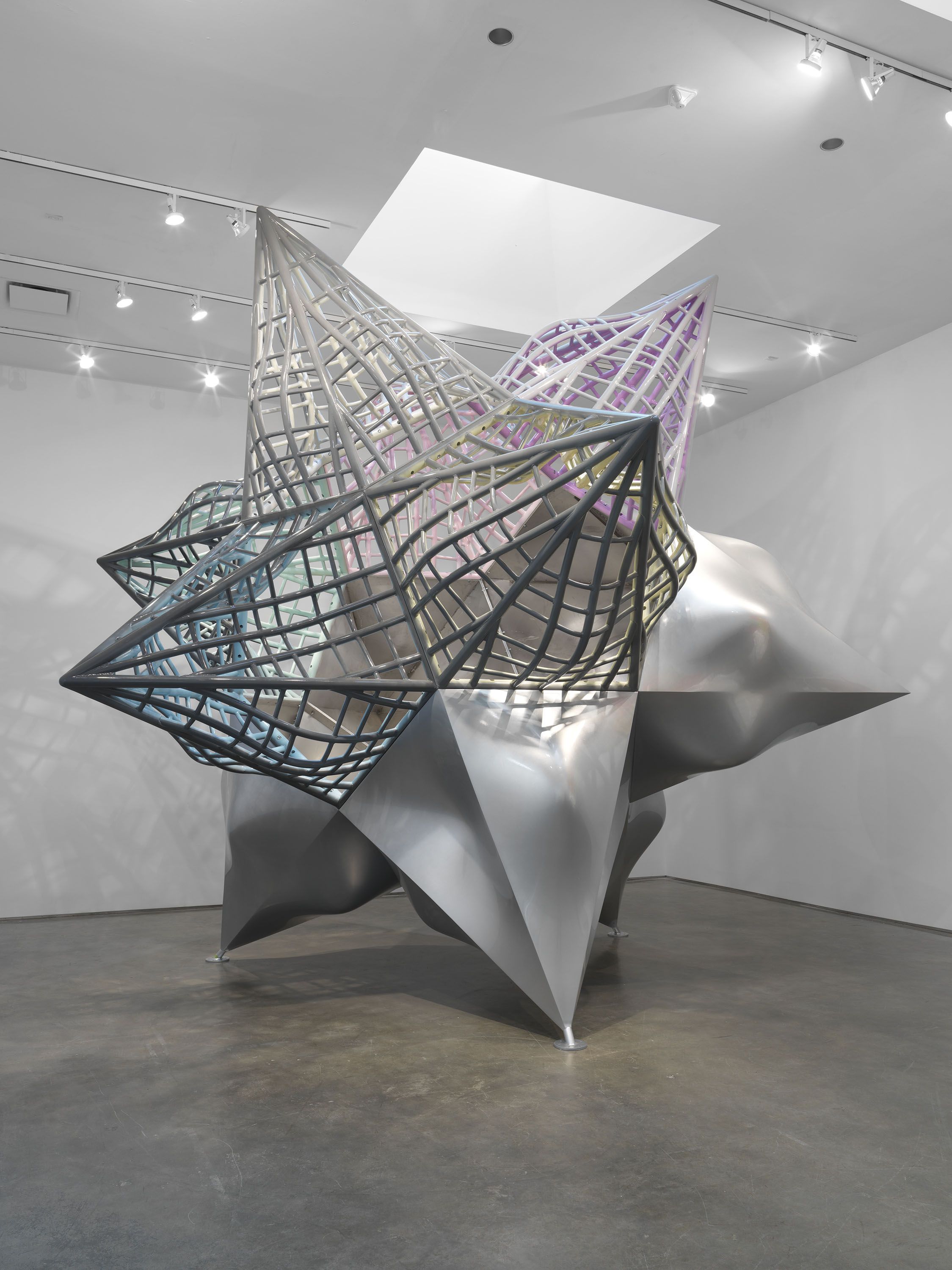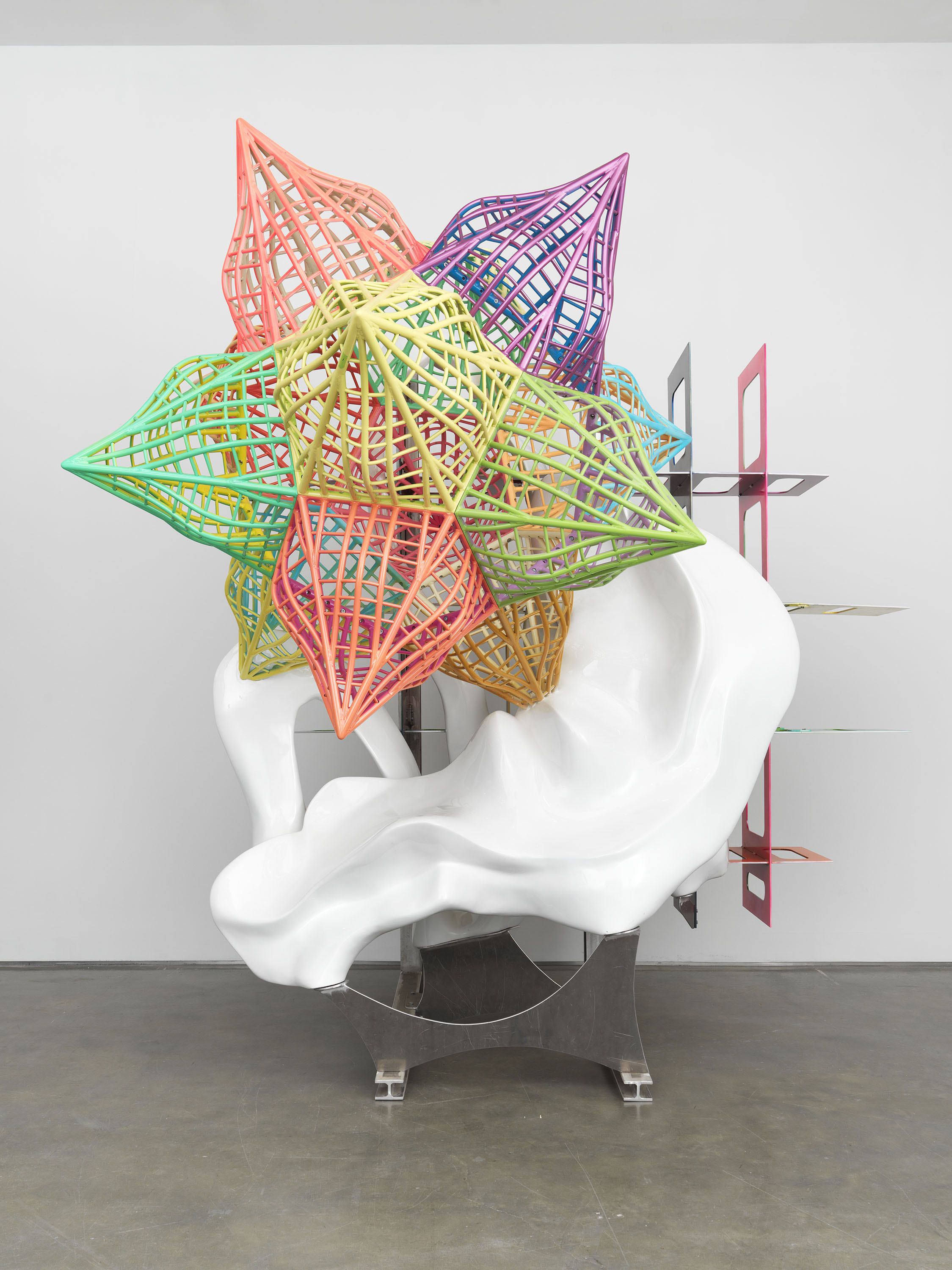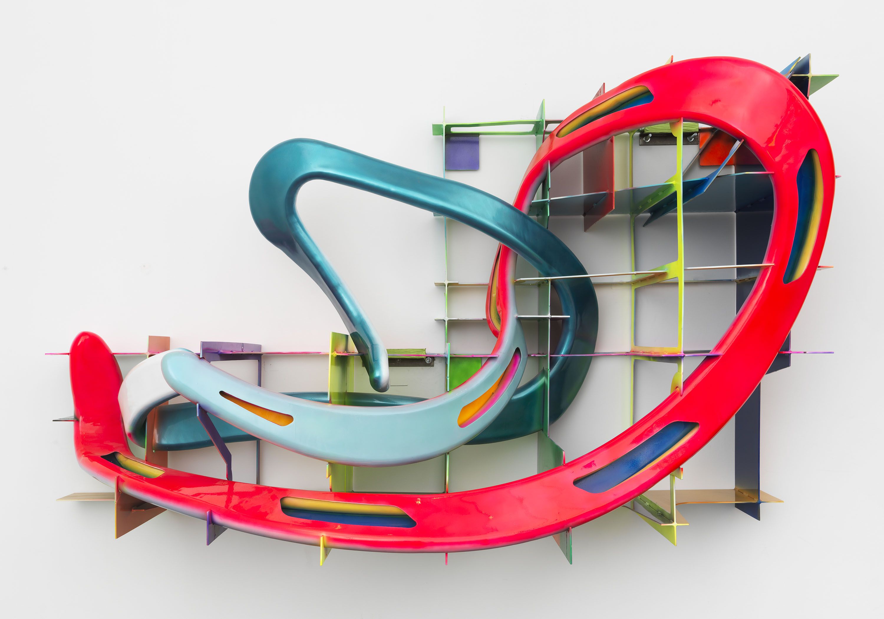 In these newest works, Stella combines interlocking grids with more fluid and organic lines, creating a dynamic interplay between minimalist and gestural visual vocabularies, and turning these interlocking, varied styles of sculpture-making into swirling orchestras of gesture and movement.  The use of line and depth, form and function hearken back to his early works as a modernist painter, and his interest in how these traditions can be set free from the picture plane, allowing gestures and colorful counterpoints to surge forth from the canvas.  The grid is always present in these works, serving as both a mounting structure and a formal backdrop against which much of his works are allowed to play on. In works like Atalanta and Hippomenes (2017), the rigid structure of the grid is broken by the application of large, billowing white forms that seem to weave and expand across the vertical and horizontal planes.  Elsewhere, works like Leeuwarden II (2017) see him turning the fiberglass grid into a jumping off point for a variety of elements,  each brightly-colored ribbon of material swooping in and out of its hard lines and mathematic logic, instilling a vivid sense of motion.  Texture and form, space and surface all work off each other, twisted through its various formal exercises into its final form.