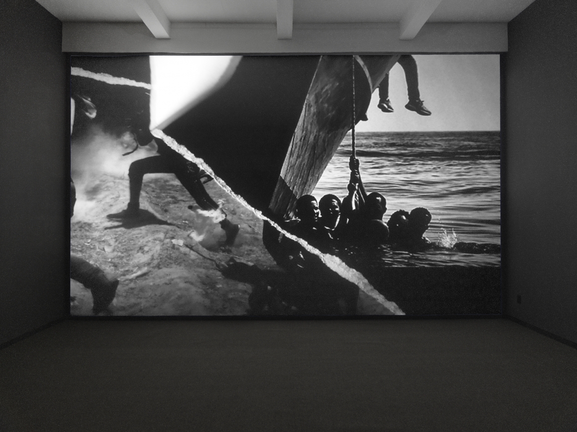 In the upstairs gallery, an immersive film installation incorporates iconic imagery extracted from the media, a range of news items and scenes pulled from the past few years, and which Longo has used as source material for some of his charcoal drawings. Taken as a whole, one is presented with a world changed by fracture and confusion, united by images like the White House downstairs, representative of leadership and guidance, yet empty to observers.