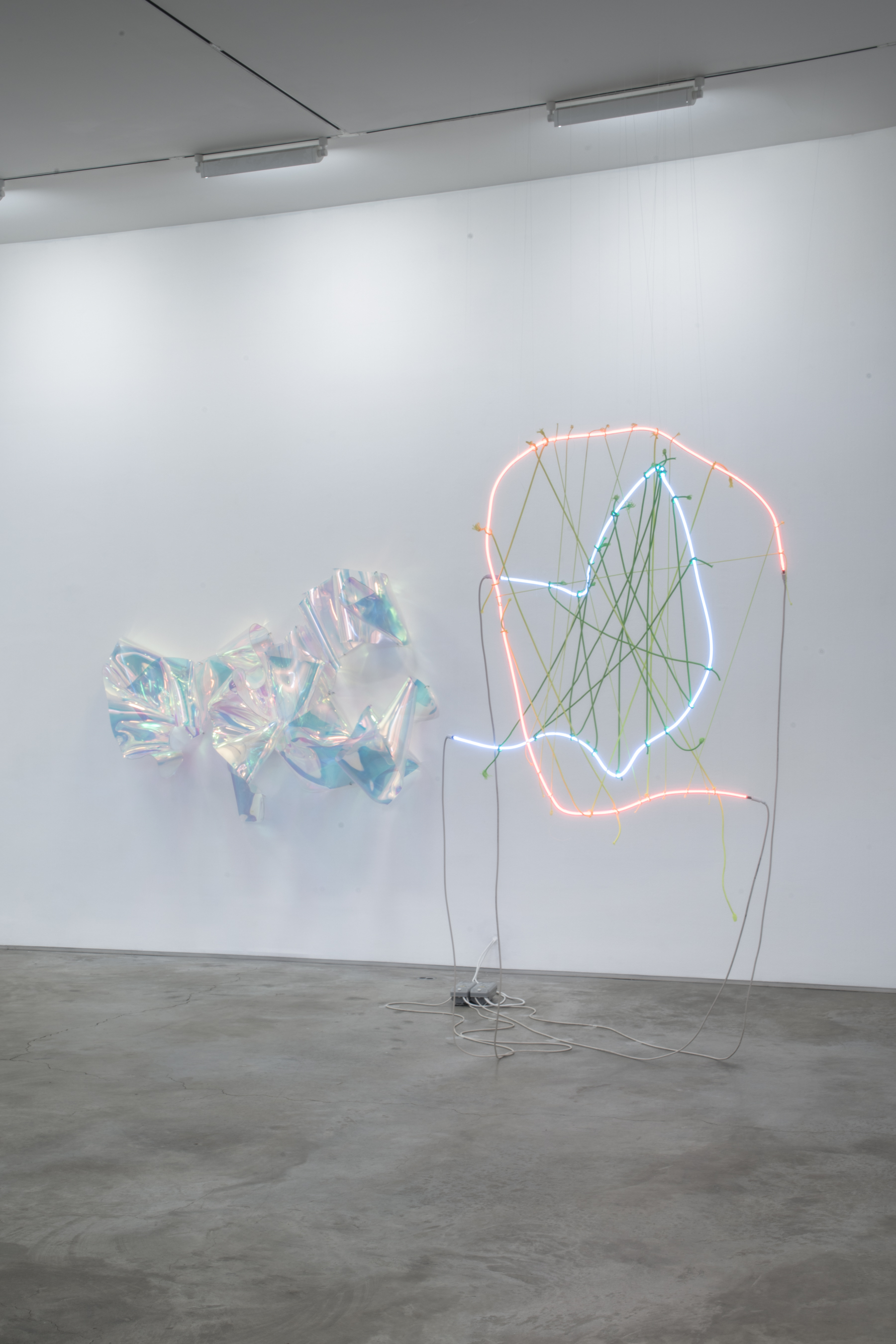 The names of these sculptures, Sokal, Ubix, and Andil, for instance lend to their galactic nature, as if they had spiraled out of the heavens and into the gallery space in some sort of chaotic moment of self-realization, pausing as they descended from earth. Created with manufactured, synthetic elements and turned towards a more complex arrangement by the artist’s hand, the sculptures are organically shaped, a marriage of nature and artificiality. Characteristic of the artist’s practice, the sculptures have both soft and aggressive features, and can be interpreted as peaceful or ominous, depending on one’s point of view. The show seems to take this sense of space and time as its central tenet, an animating principle that provides an entry point for both the viewer’s experience of the work, and the artist’s continued evolution and iterations of her swirling landscapes, all employed towards the creation of a new gestural language.
