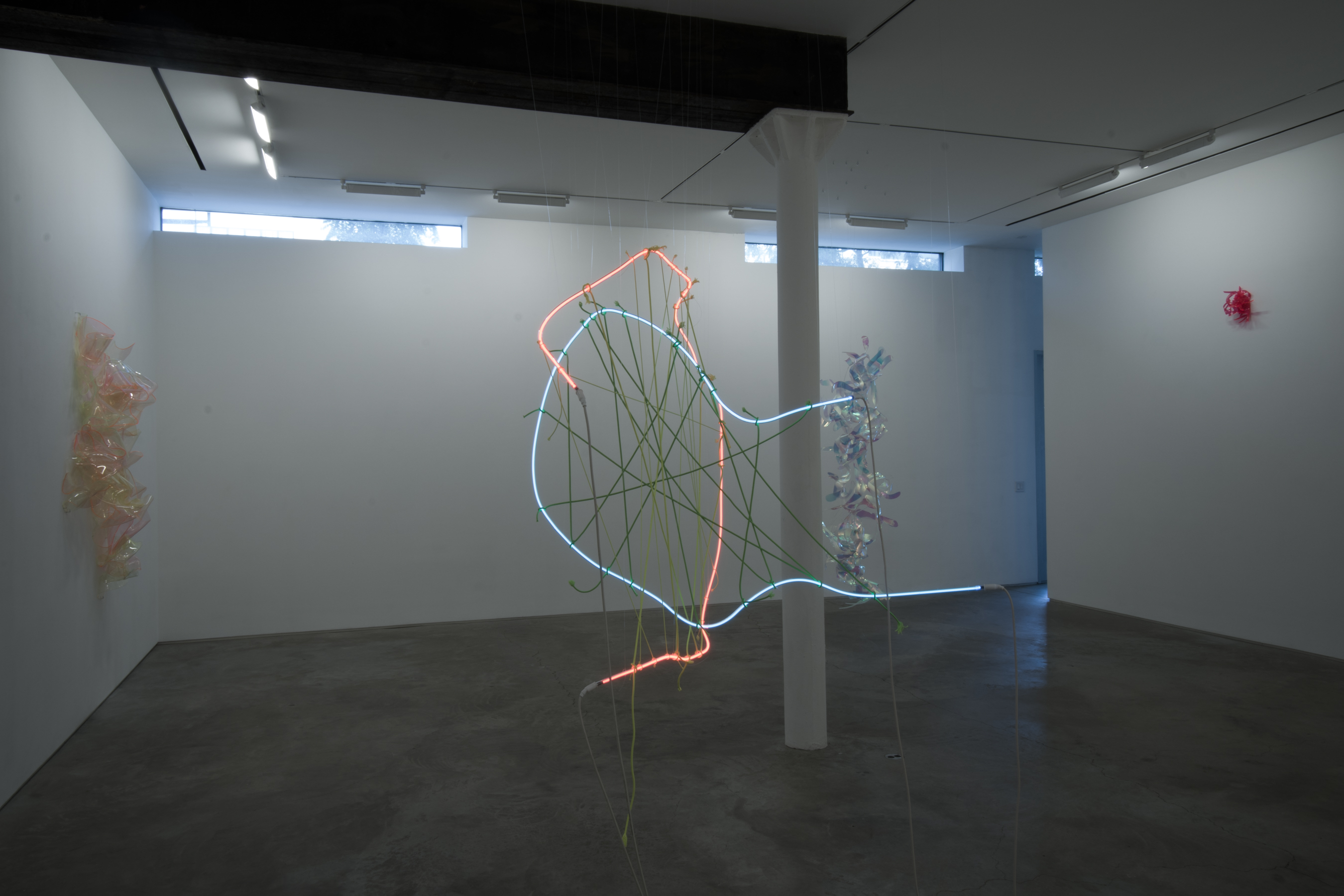 Fischer creates abstract sculptures using synthetic materials, working plastic and acrylic glass into complexly arrangements clusters that twist and bend in their pathway through space. Objects that draw their energy from simple contrasts of color, light, and form, Fischer’s sculptures appear to have a life of their own and together transform a space into an almost ethereal setting, bathing their surroundings in gentle halos of light, while pulling the viewer’s eyes through an orchestration of movements and fragments. Simultaneously regal and simple in their presentation, the exhibition seems to treat space as the ground against which each element serves as a gesture, an action and counterpoint that creates a swirling, kaleidoscopic final effect.