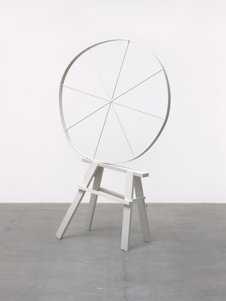 In contrast to the paintings, the sculptures in the exhibition are painted a ghostly white. Hume’s familiar Wonky Wheels, the basis of these works, appear here both restrained and energized by elements suggestive of human interaction. Offering a sort of formal counterpoint, his pieces here seem nevertheless to recall the absence of a body, the animating factor that would give these wheels a purpose or set them in motion. For Hume, the alternations between familiar forms and a violent break with reality makes for a potent space to explore the world as it stands now.