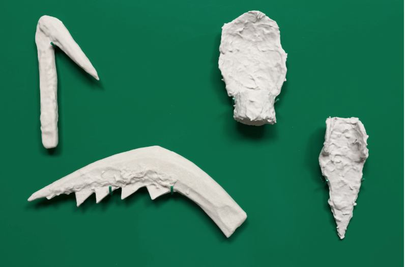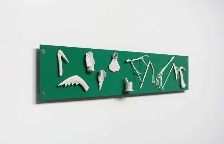 For the past decade, Glynn has worked in sculpture, installation, and performance, examining the ways in which cultural objects of the past embody or confront power dynamics, social structures, and systems of value. This particular series takes this concept directly to early technological power, the roughshod tools and early implements employed by man to remake the world around him. In each of the works on view, a set of related gypsum objects are mounted to a powder-coated steel panel. Primitively sculpted by hand out of paper mache, scanned, and output with a 3-D printer, the ghostly white tools appear in stark contrast to their high-chroma, polished backings. Glynn poses herself as both historian and philosopher here, posing various technologies, value systems and concepts within single spaces, allowing the viewer to pass through varied eras and ideas within a single piece. Titled with infinitive verbs emphasizing action—such as To Sow, To Cut, or To Write—the works categorize tools, which date from prehistory up to the industrial revolution, according to purpose or methods of productivity. Resembling ossified specimens in a display case, the series invites deliberation on the uncertainty of objects, labor, and authorship in the increasingly virtual world. These conversations open up onto the commonality of desires, and the human ingenuity that blossoms from a state of need.